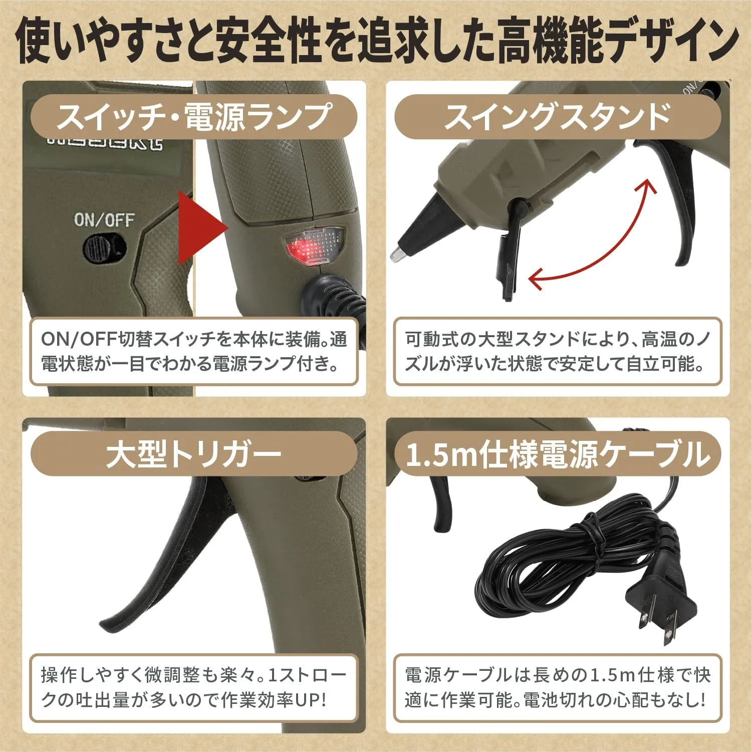 【液だれ防止機能・スイングスタンド付き】トリガーが握りやすく吐出量も調節しやすいため、スムーズな作業が可能。溶けたグルーが垂れることなく快適に使用できます。スイングスタンドで本体を自立させることができ、高温のノズル部分の接触やグルーの逆流を防ぎます。