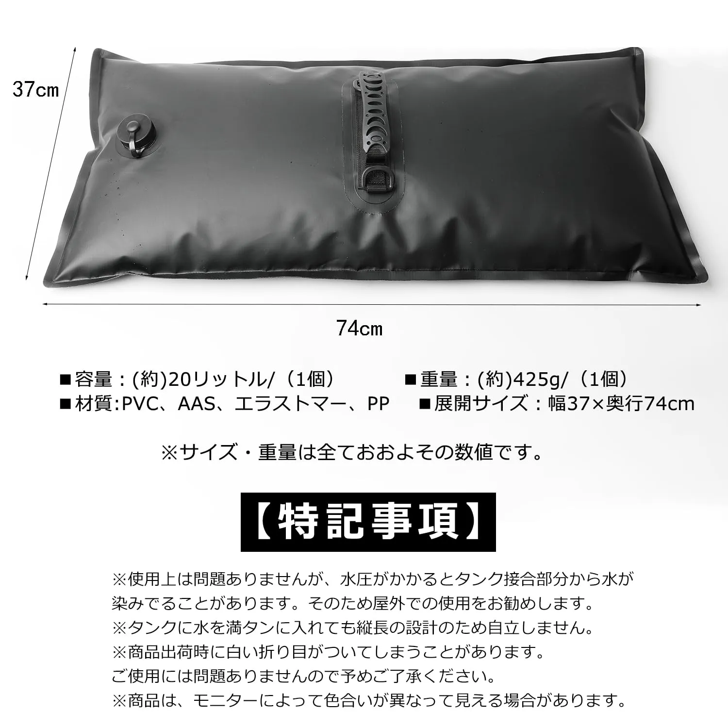 【新改良】シェード 重し 固定 注水ウエイト 安定用重し袋 最大20Kg 下部用 サンシェード 取付 ベランダ 目隠し 注水タイプ アウトドア 万能 転倒防止 重ね置き可能 強固 (2) 色: 給水時の重さ約20kg(1個あたり)_サイズ: 2個入り サイズ:約幅37cm×奥行74cm、重量:約425g、材質:PVC、AAS、エラストマー、PP。 カラー:ブラック、給水時の重さ:約20kg(1個あたり)、2個組。高強度防水、サンブロック、お手入れ簡単、再利用可能です。 コンクリートやデッキ・タイル上に適しています。お庭の芝生上でも大丈夫。やわらかい素材なので床にキズがつけにくく設置面が広いので本体が動きにくい。使わない時は水を抜いてコンパクトに収納できます。 注水ウエイトに水を入れシェードの下部にヒモを付けてヒモ用通して固定したりと使い方がいろいろ可能です。 万が一商品に不具合がある場合は、弊社にご連絡いただければ迅速に対応いたします。
