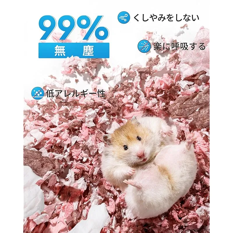 【99%の無塵・低アレルギー性】加熱殺菌および複数の除塵処理により、小動物の呼吸を守ります。天然染料を使用し、水に濡れても色あせしません。