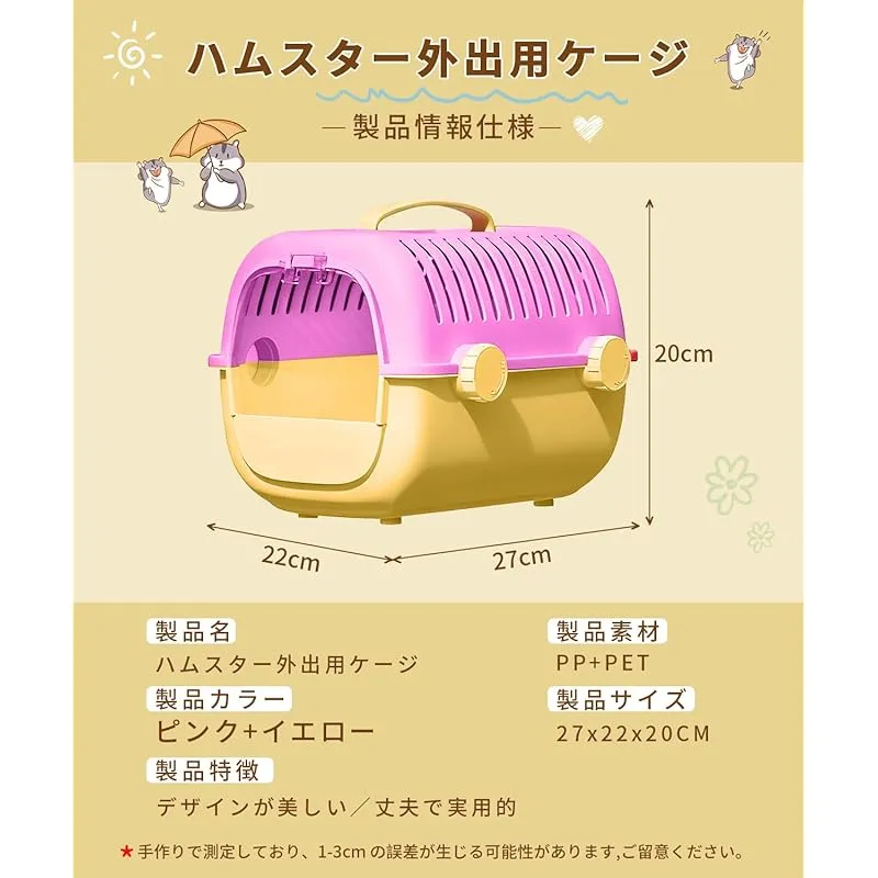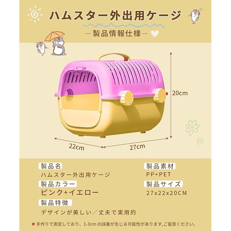 【商品詳細】 ブランド:RhyzoZyne 商品種別:小動物用お出かけ用品 商品名:RhyzoZyne 小動物 お出かけケージ ハムスター キャリーケース 給水器付き 通気性 モルモット チンチラ オウム 小鳥 外出専用豪華ヴィラ 移動 帰省 通院 旅行 ハンドル付きで持ち運び便利 掃除簡単 (ピンク+イエ口一) 製造元:Rhyzozyne 商品番号:Hamt-001 商品内容:27x22x20センチメートル 色:ピンク+イエ口一 商品タイプ:ポータブル