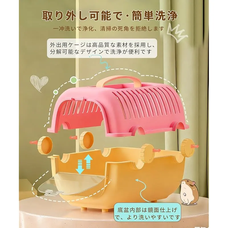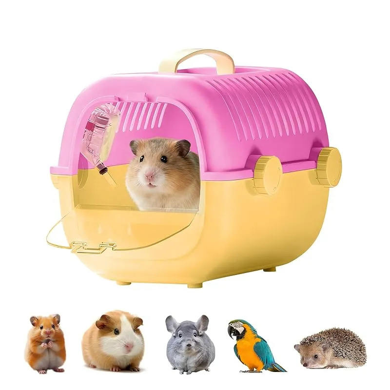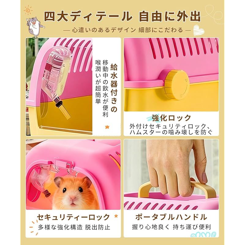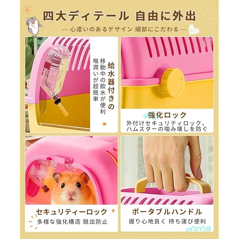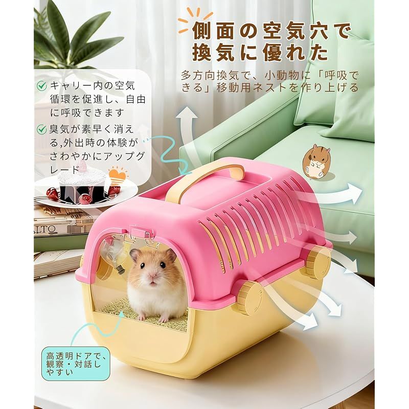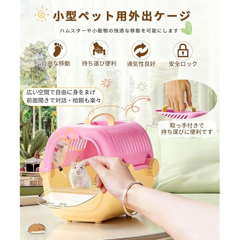 RhyzoZyne 小動物 お出かけケージ ハムスター キャリーケース 給水器付き 通気性 モルモット チンチラ オウム 小鳥 外出専用豪華ヴィラ 移動 帰省 通院 旅行 ハンドル付きで持ち運び便利 掃除簡単 (ピンク+イエ口一)