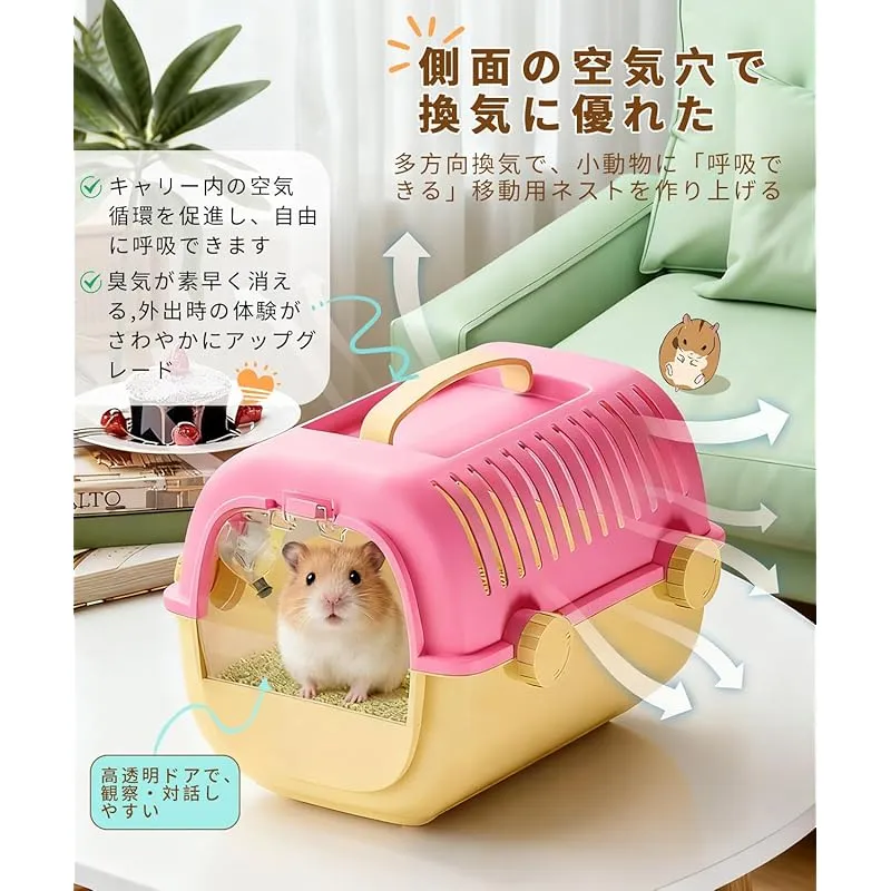 【商品説明】 通気性抜群: スリット設計により優れた換気を実現し、ペットの快適な環境を確保します。 給水器付き: 便利な給水器が付属し、外出時の水分補給が簡単に行えます。 安全設計: セキュリティロックと強化構造により、ペットの脱出を防止し、安全な移動を実現します。 持ち運び便利: 快適なハンドル付きで、通院や旅行時の持ち運びが簡単です。 コンパクトサイズ: 27×22×20cmのサイズで、ハムスターや小動物に最適な空間を提供します