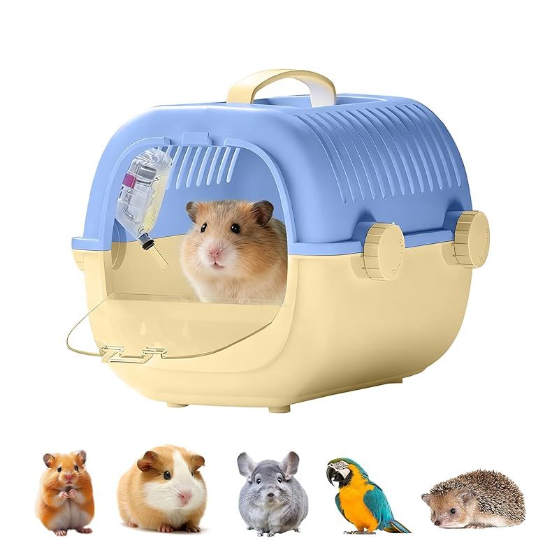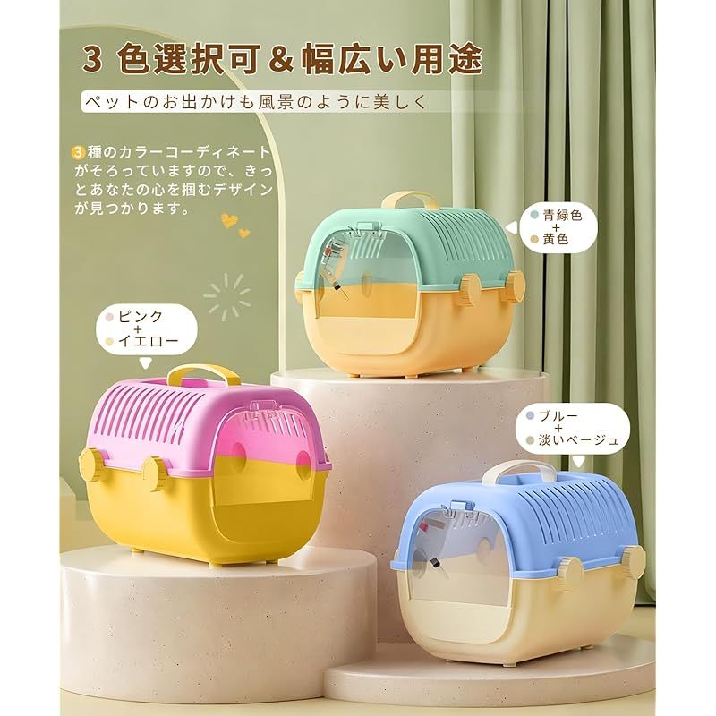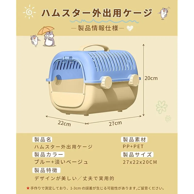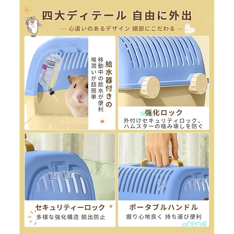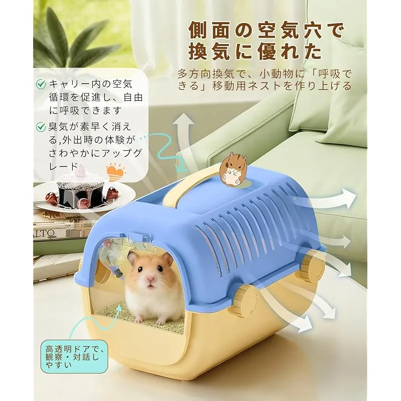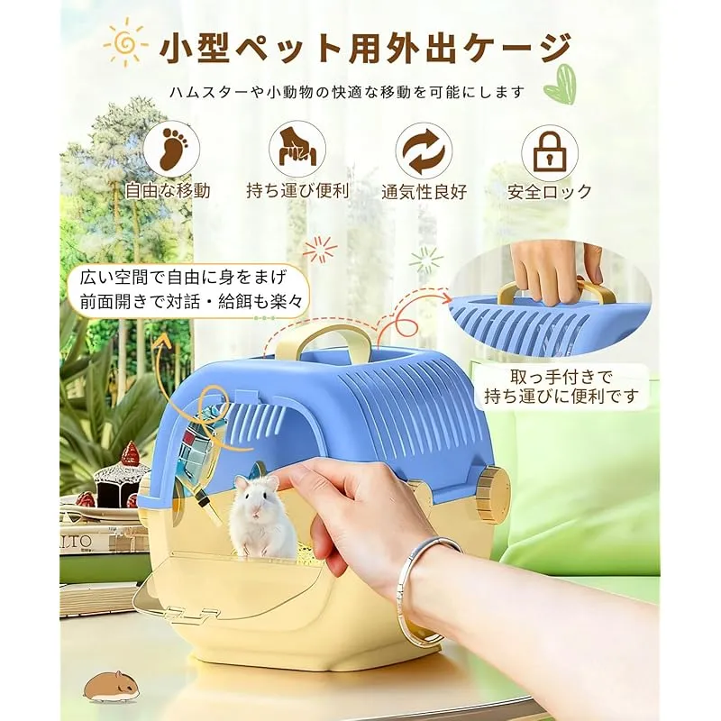 【商品説明】 通気性抜群: スリット設計により優れた換気を実現し、ペットの快適な環境を確保します。 給水器付き: 便利な給水器が付属し、外出時の水分補給が簡単に行えます。 安全設計: セキュリティロックと強化構造により、ペットの脱出を防止し、安全な移動を実現します。 持ち運び便利: 快適なハンドル付きで、通院や旅行時の持ち運びが簡単です。 コンパクトサイズ: 27×22×20cmのサイズで、ハムスターや小動物に最適な空間を提供します