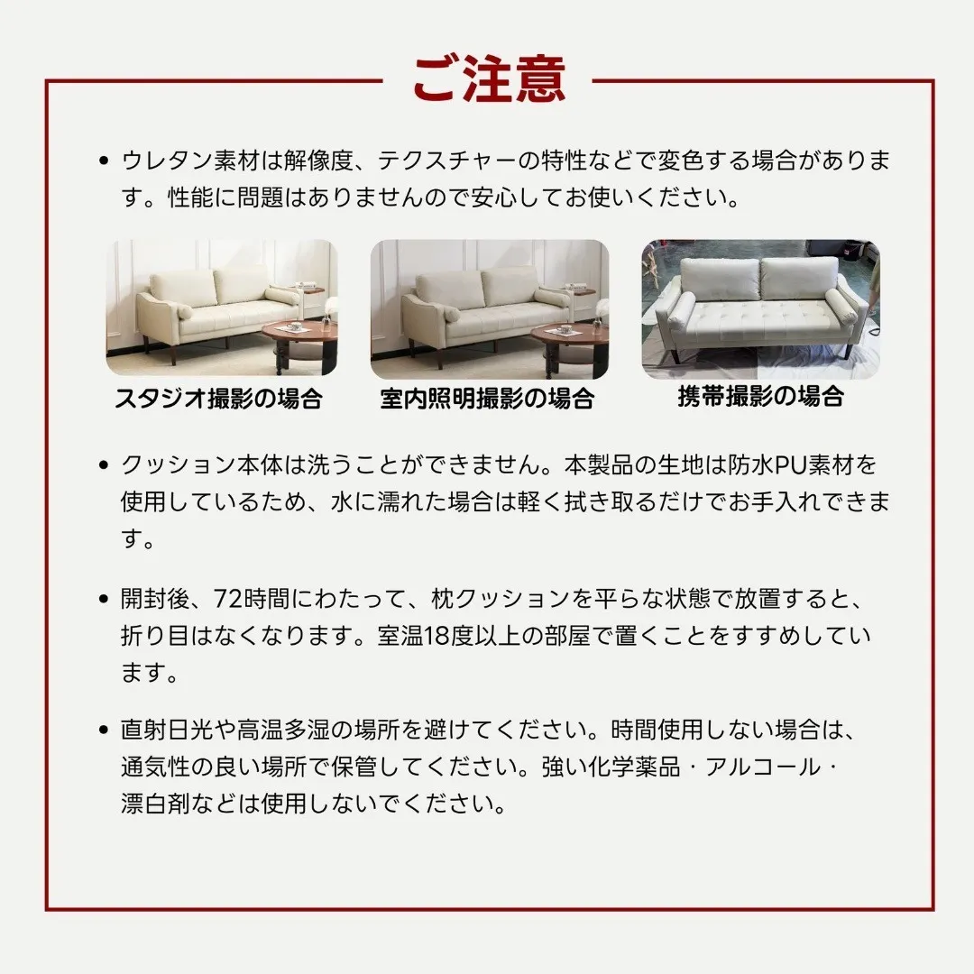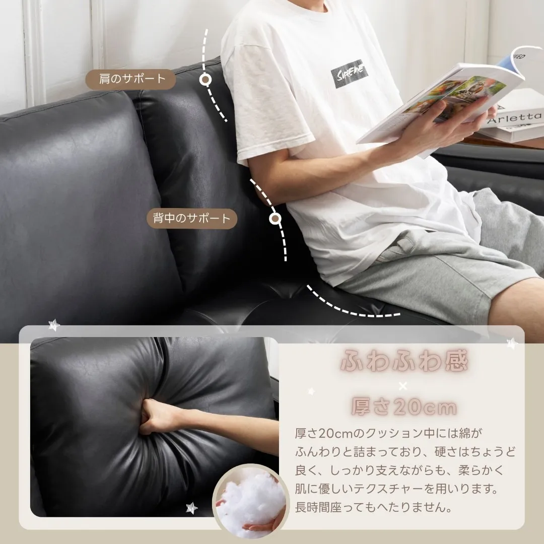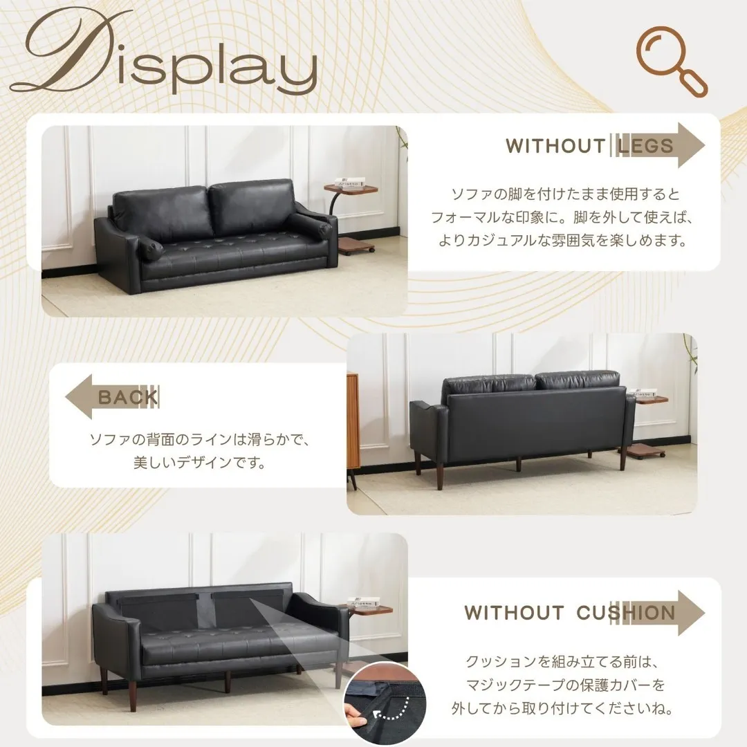 ソファ 3人掛け カウチソファ リビングソファ PUレザー 肘掛け付き 枕付き 高耐久 構造 二層クッション 収納 省スペース 北欧風デザイン お手入れ簡単 組立簡単 ローソファ仕様 木脚付き 洗練された 高級感 クッション付き 多用途