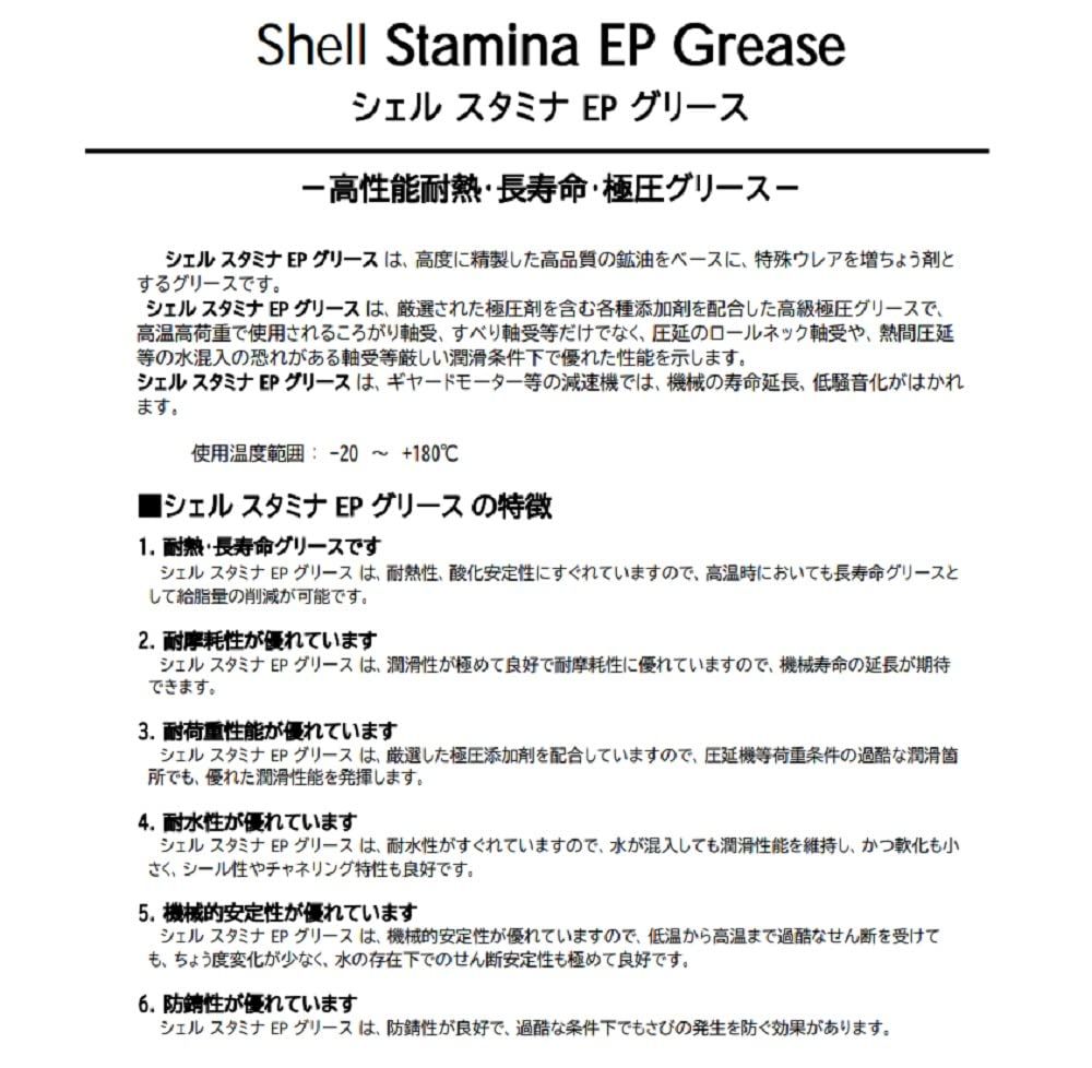 ■シェル スタミナ EP グリース の特徴 1.耐熱・長寿命グリースです シェル スタミナ EP グリース は、耐熱性、酸化安定性にすぐれていますので、高温時においても長寿命グリースとして給脂量の削減が可能です。 2.耐摩耗性が優れています シェル スタミナ EP グリース は、潤滑性が極めて良好で耐摩耗性に優れていますので、機械寿命の延長が期待できます。 3.耐荷重性能が優れています シェル スタミナ EP グリース は、厳選した極圧添加剤を配合していますので、圧延機等荷重条件の過酷な潤滑箇所でも、優れた潤滑性能を発揮します。 4.耐水性が優れています シェル スタミナ EP グリース は、耐水性がすぐれていますので、水が混入しても潤滑性能を維持し、かつ軟化も小さく、シール性やチャネリング特性も良好です。 5.機械的安定性が優れています シェル スタミナ EP グリース は、機械的安定性が優れていますので、低温から高温まで過酷なせん断を受けても、ちょう度変化が少なく、水の存在下でのせん断安定性も極めて良好です。 6.防錆性が優れています シェル スタミナ EP グリース は、防錆性が良好で、過酷な条件下でもさびの発生を防ぐ効果があります。 最後までご確認頂き誠にありがとうございました。 ご確認頂き、ご購入いただけましたら幸いです。 何かご不明点などがございましたらお気軽にメッセージからお問い合わせ下さい。