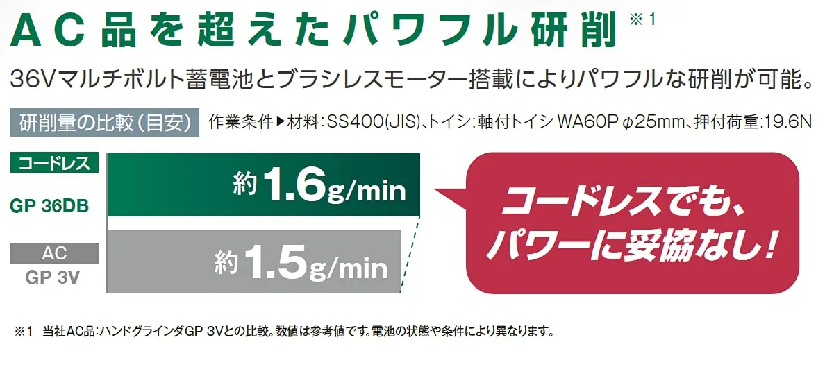 AC品を超えたパワフル研削※ 36Vマルチボルト蓄電池とブラシレスモーター搭載によりパワフルな研削が可能。 ※当社従来品GP3Vとの比較