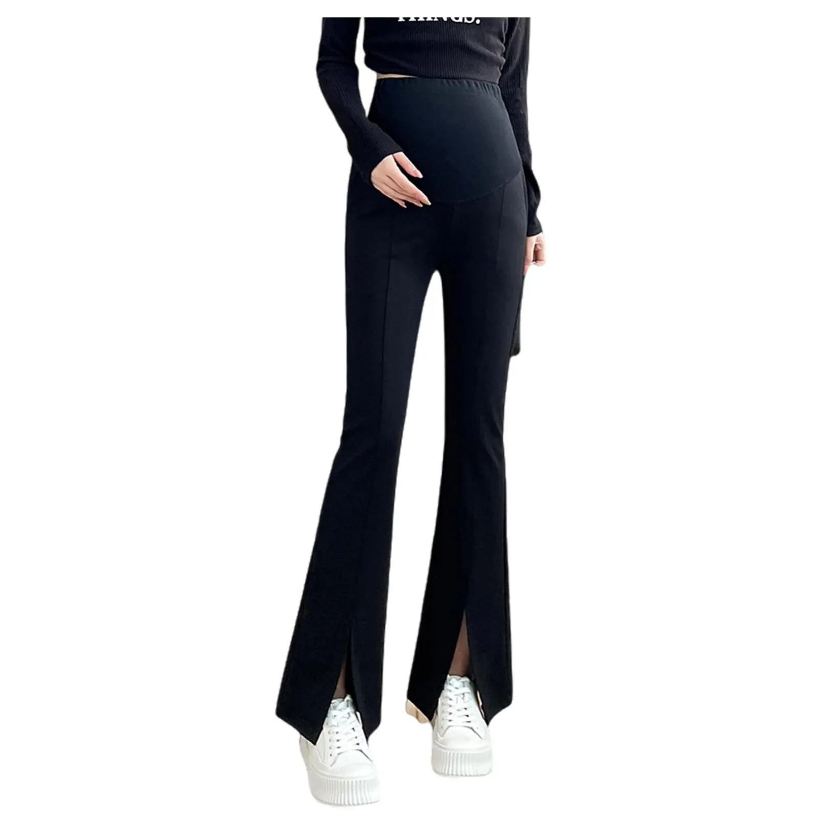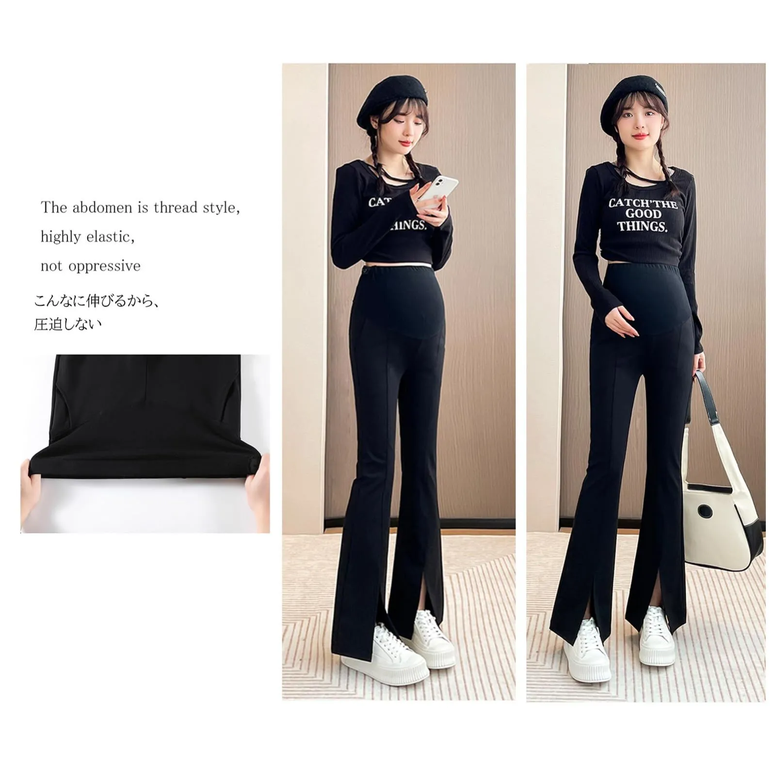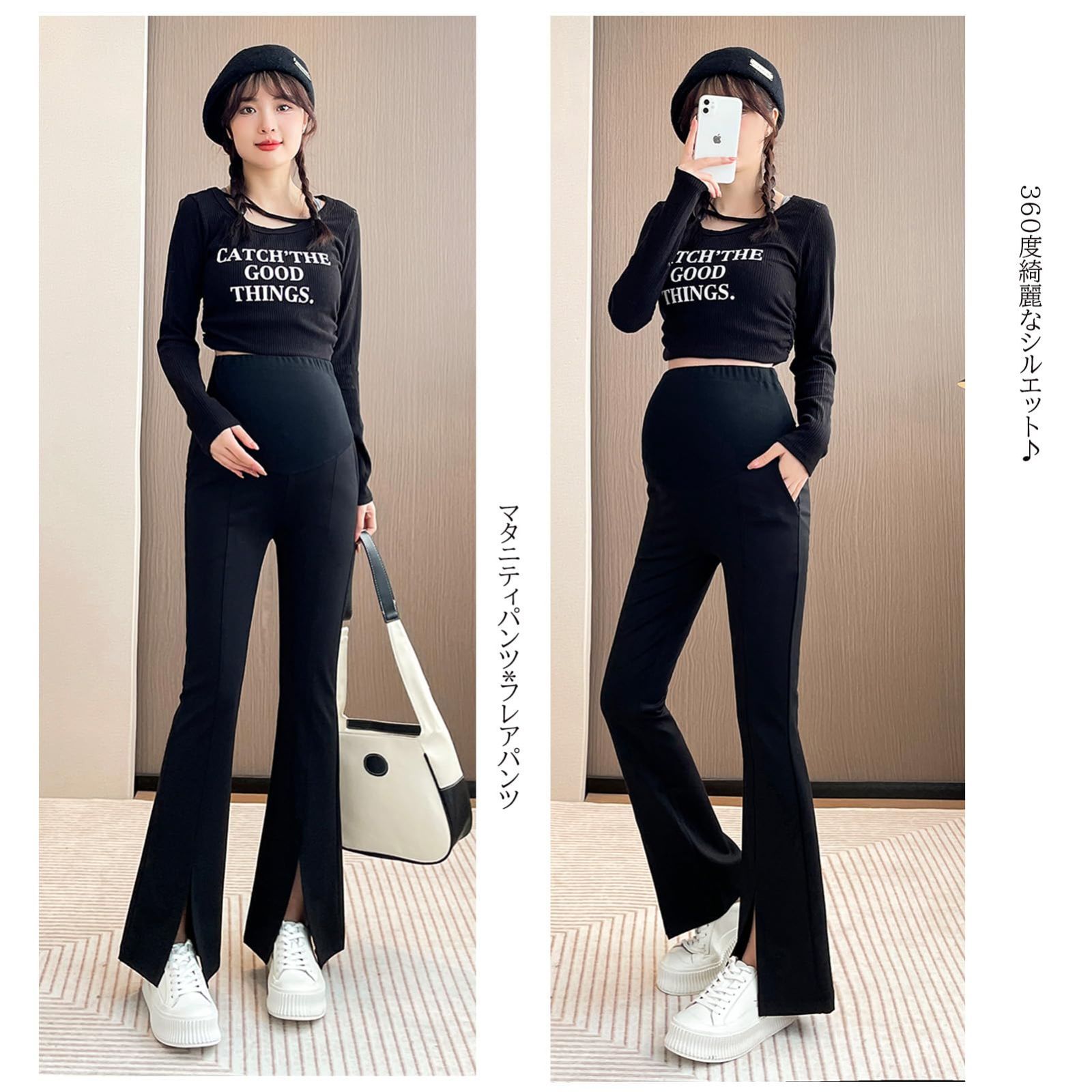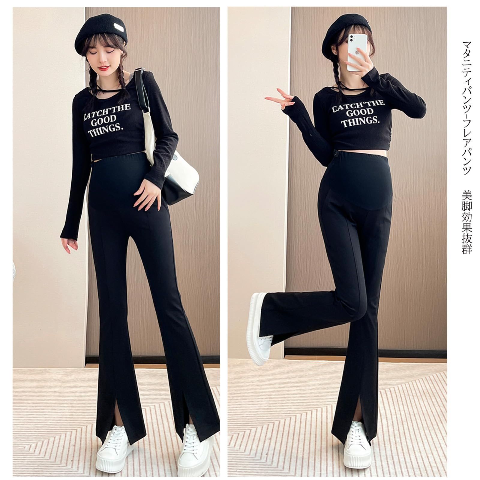 フレアパンツ スリット入り マタニティパンツ ブーツカット妊娠のズボン ウエスト調整 ポケット付き [Onabebi] 美ライン カジュアル 足長効果
