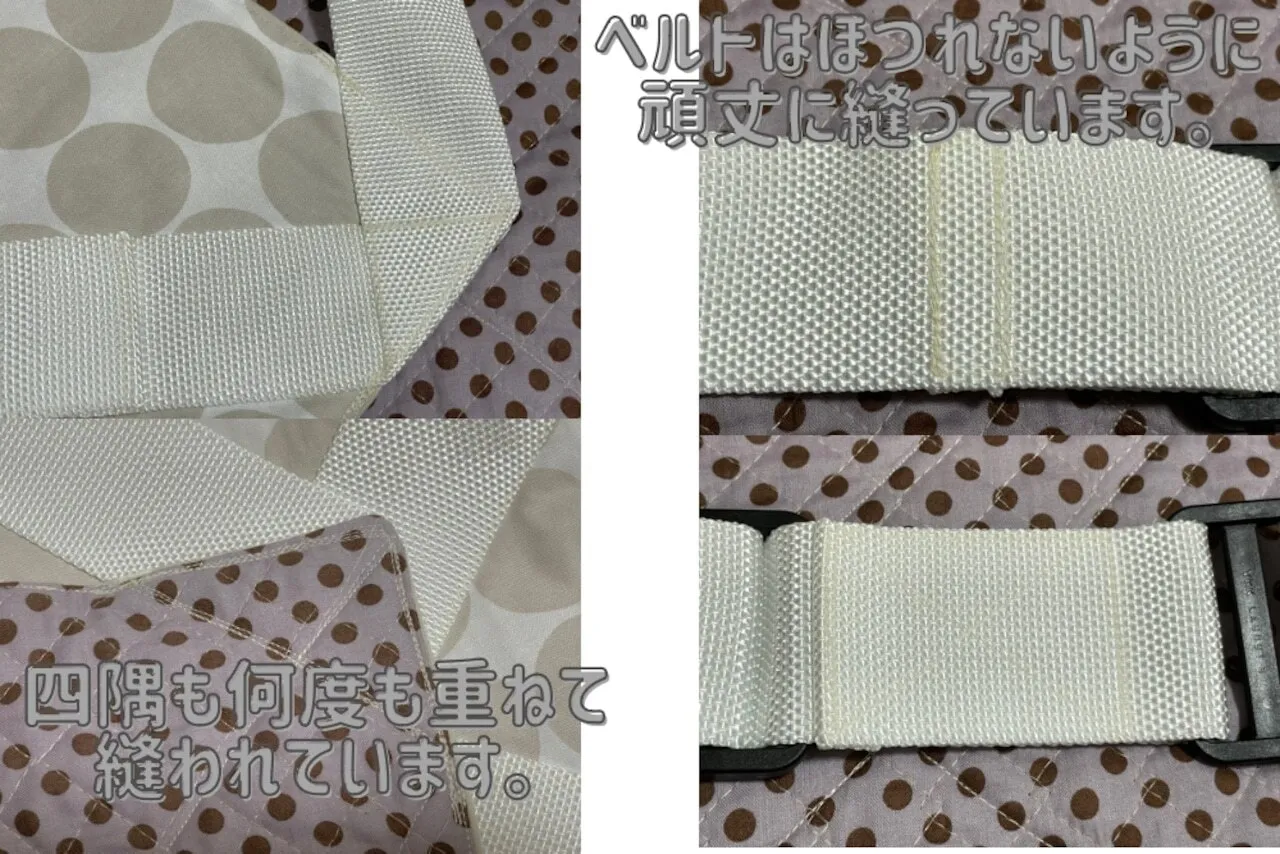 クロスのベルトと内側のキルト生地でしっかりと支えます。