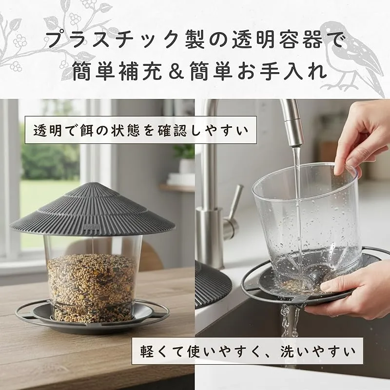 【 エサの補充が楽々 】透明な容器でエサの残量が一目でわかるから、小鳥たちに常に新鮮なエサを提供できます。