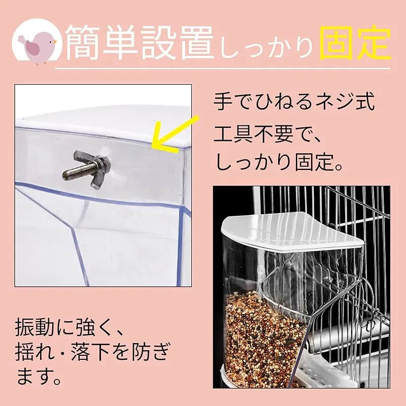 【ケージ取り付けで安定&省スペース】 ネジ固定式パーツにより、丸型・四角型問わず様々な鳥かごにしっかり取り付けできます。振動やつつきによるズレや落下を防止。設置・取り外しに工具は不要で、掃除や補充もスムーズに対応可能。スペースを取らないコンパクト設計で、多羽飼いや狭いケージにも便利です。