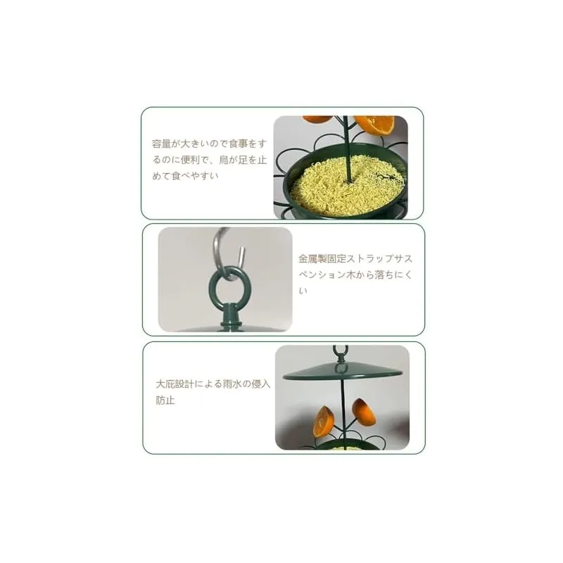 【防雨装置】屋外用の鳥の餌箱には雨よけの屋根が付いており、鳥の餌が湿って腐るのを防ぎます。この考え抜かれた設計により、鳥は雨の中でも問題なく餌を食べることができます。