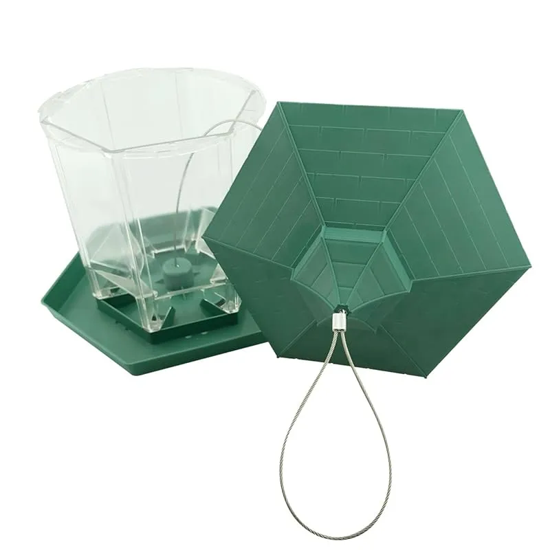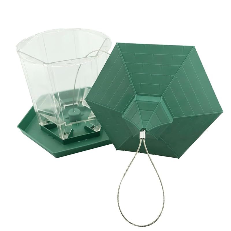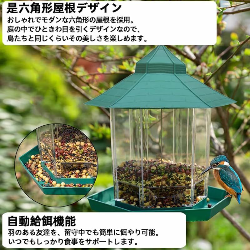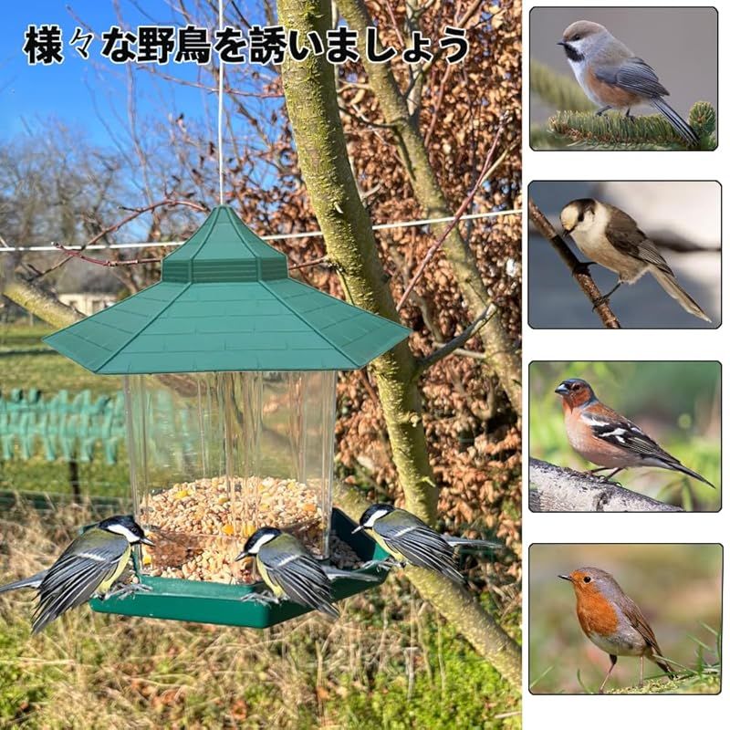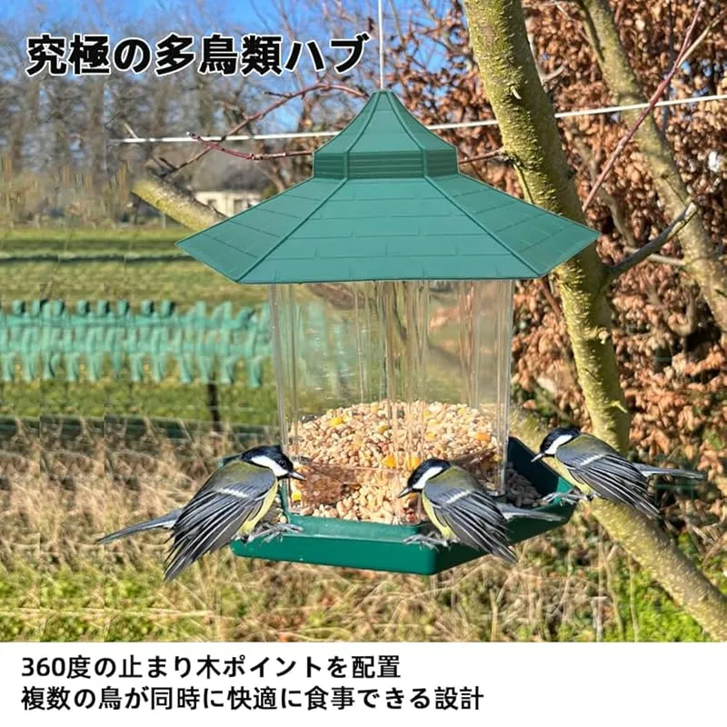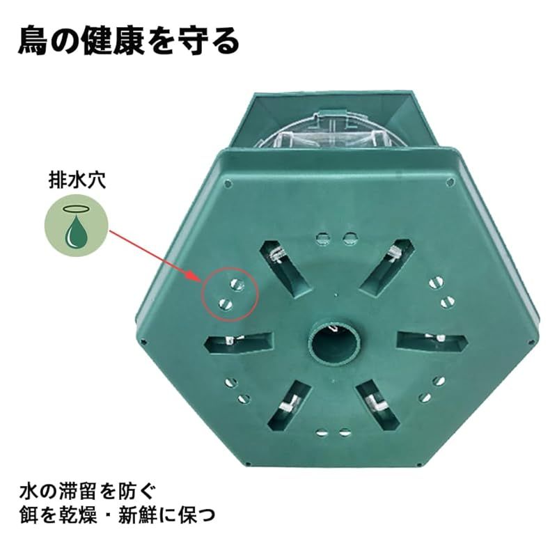 【商品概要】 約1kgのエサを設置することができるバードフィーダー。透明な容器はエサの容量を簡単に把握することができる エサが食べられると自然にエサが落ちる仕組みになっており新鮮なエサを供給する。六角形の屋根は日陰を作るとともに小鳥を雨から守る 風通しの良い構造が常に新鮮で乾燥したエサを自動で供給する。何羽もの小鳥が同時に快適にエサを楽しむことができるたっぷりとしたスペース 鋼鉄製の吊るしケーブルは安全に木や柱などに取り付け可能。回転式ロックキャップがしっかり安全に蓋を閉める。またエサを補充するのも簡単。他の動物がエサにたどり着くのを防ぎより小鳥たちに安心な場所を提供する 小鳥例:スズメ、メジロ、ウグイス、ツバメ、モズ、シジュウカラ、ヤマガラなど おすすめの設置場所:庭、山、公園、田畑など エサ例:ひまわりの種、紅花の種、ピーナッツなど
