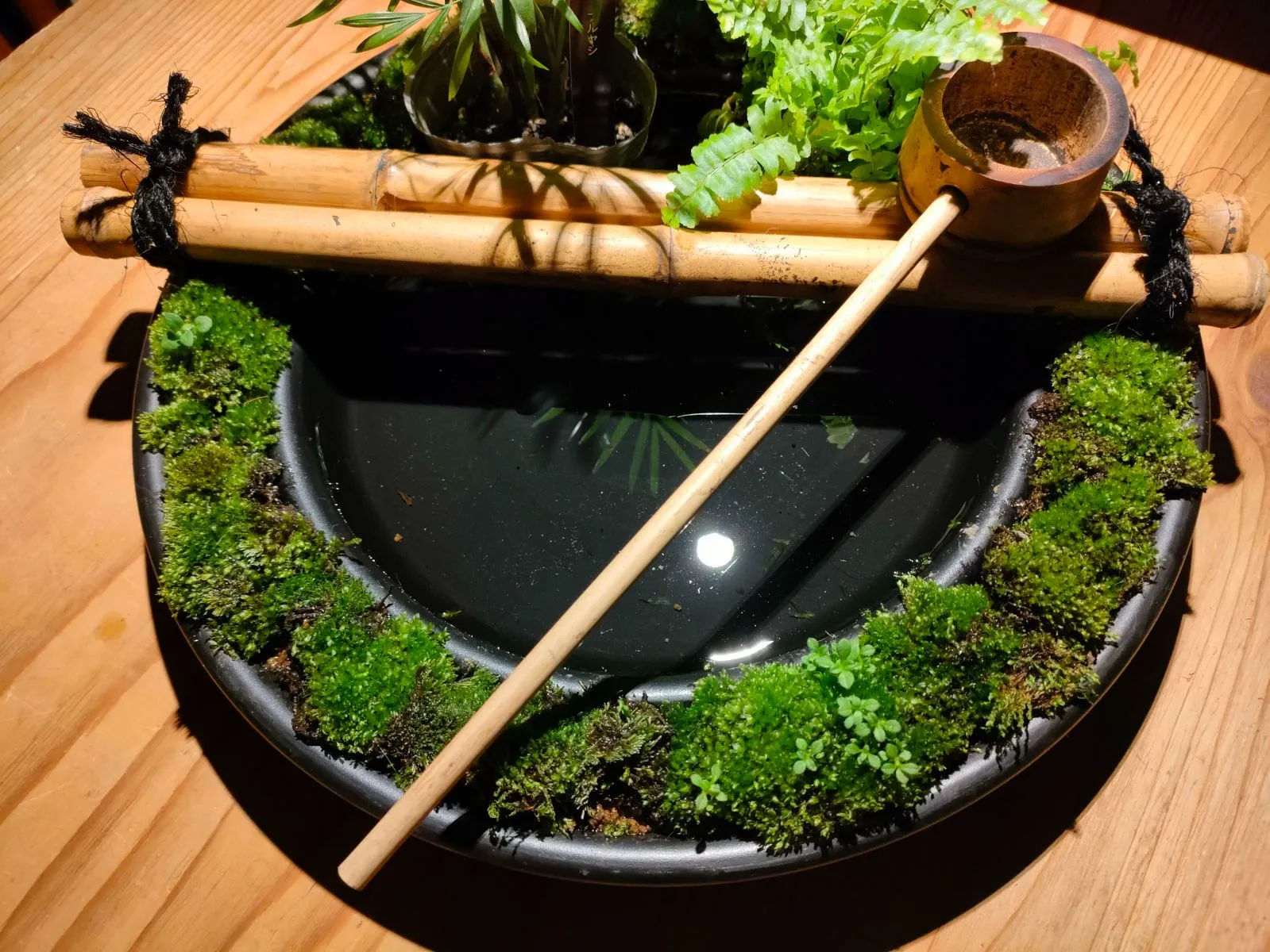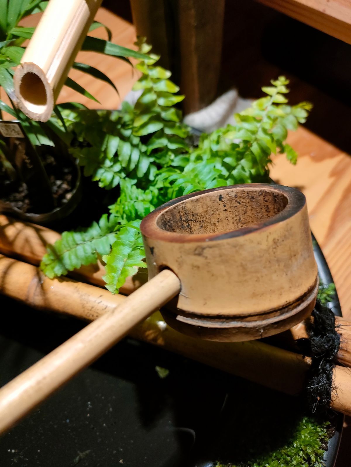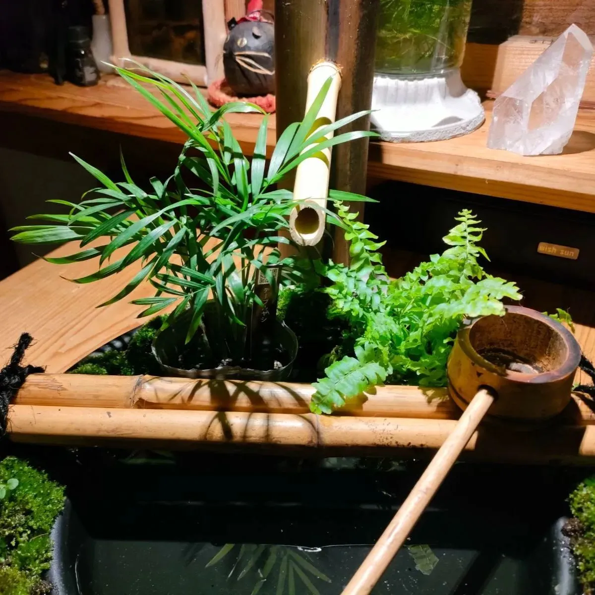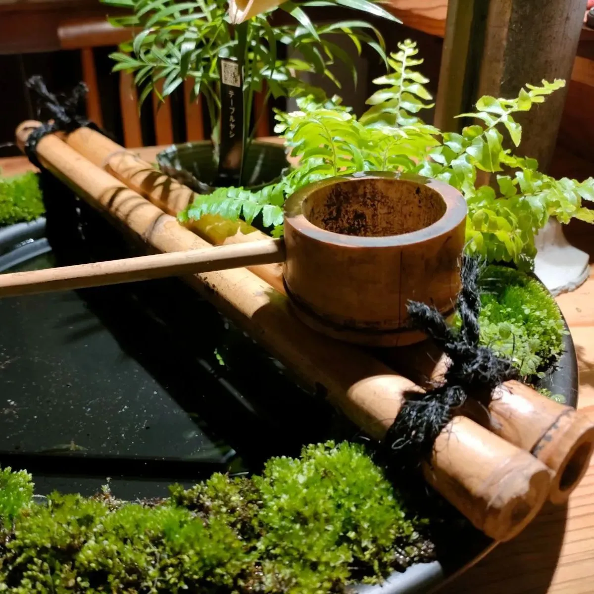 →筧、柄杓、杓架、お皿に苔をセットした器に水草(アナカリス)、ミニ観葉植物2鉢(画像はテーブルヤシ+シダ類となっておりますが入手状況によって変更になる場合があります予めご了承ください。)