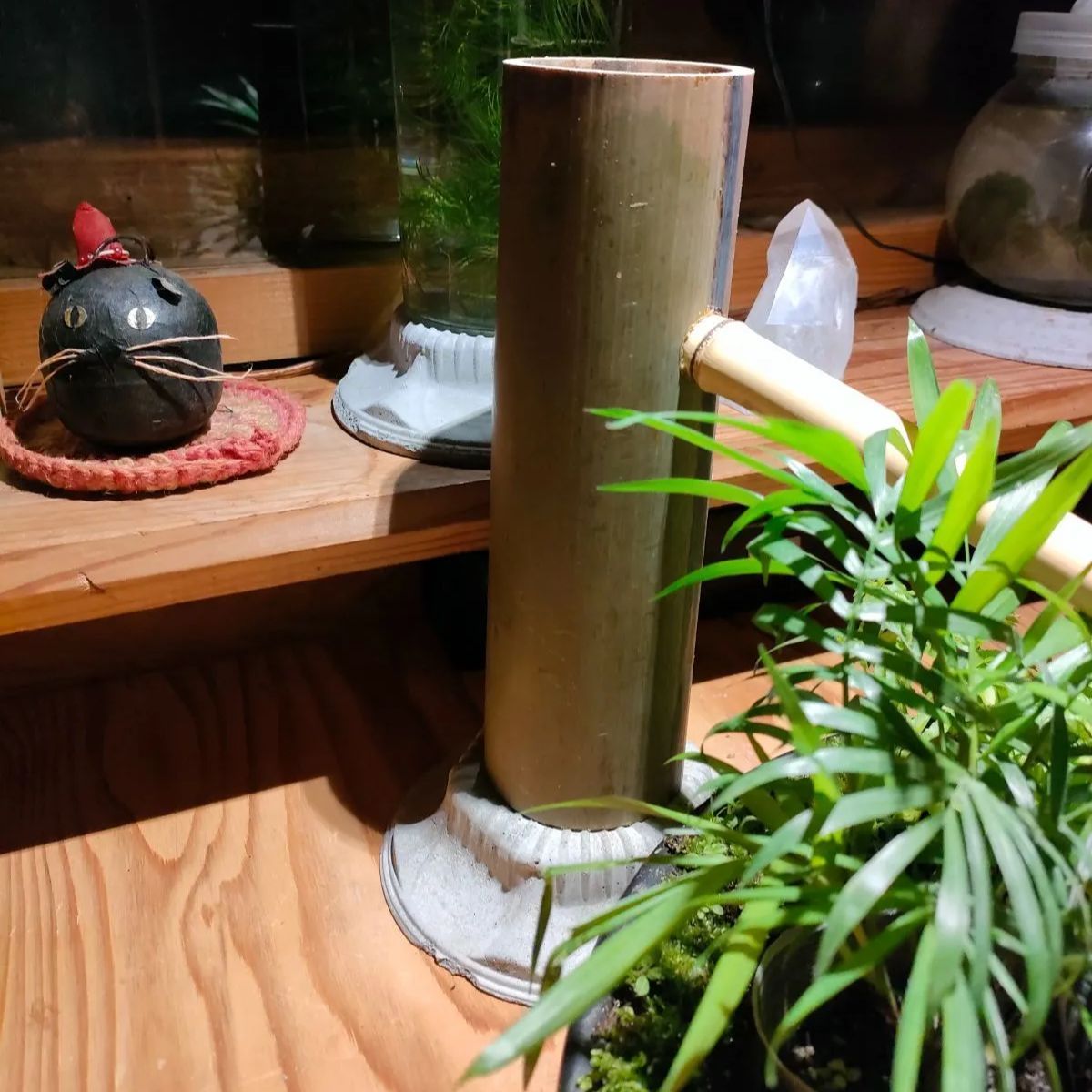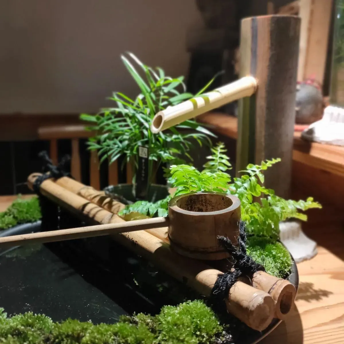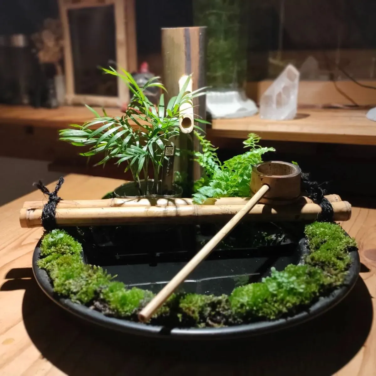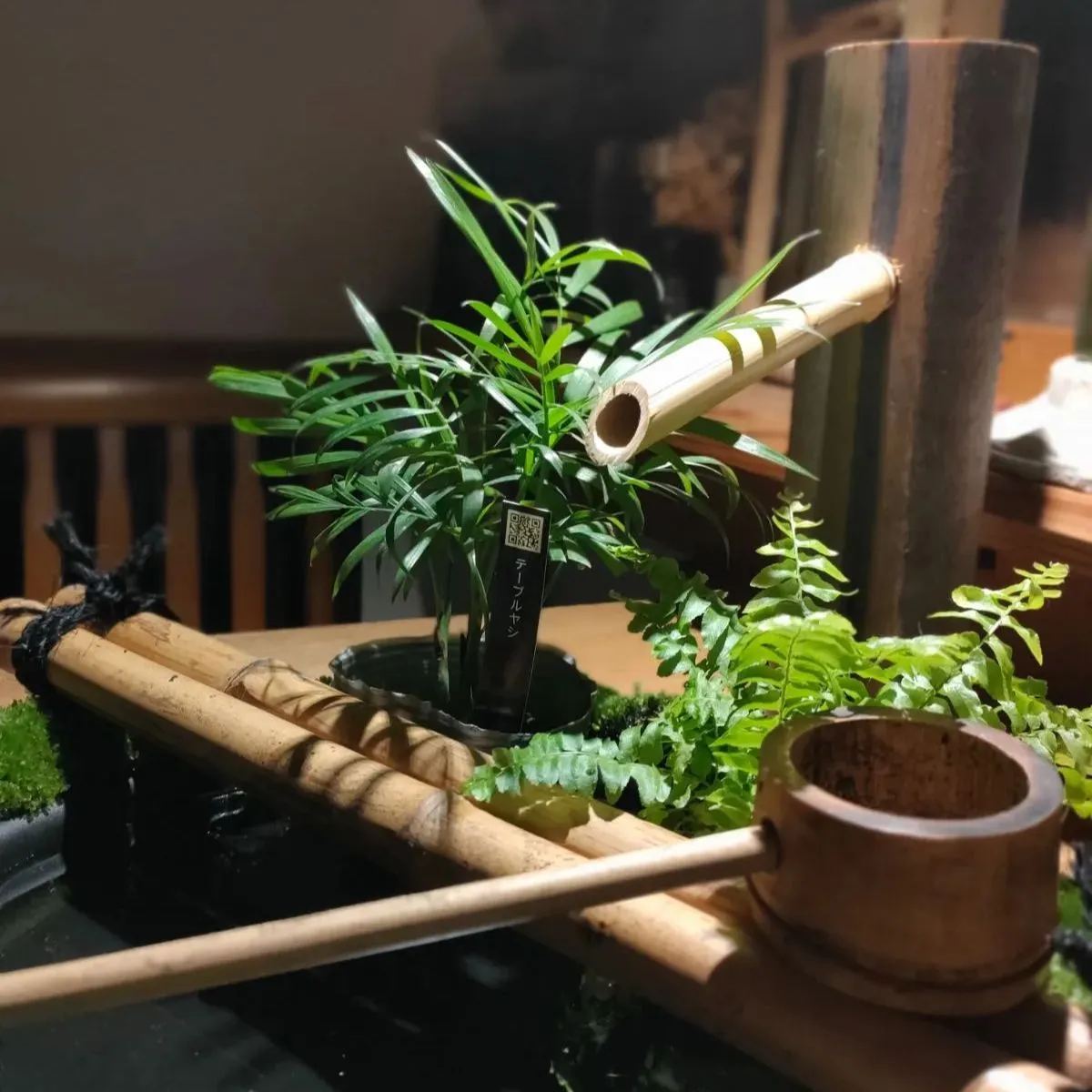 →筧、柄杓、杓架、お皿に苔をセットした器に水草(アナカリス)、ミニ観葉植物2鉢(画像はテーブルヤシ+シダ類となっておりますが入手状況によって変更になる場合があります予めご了承ください。)
