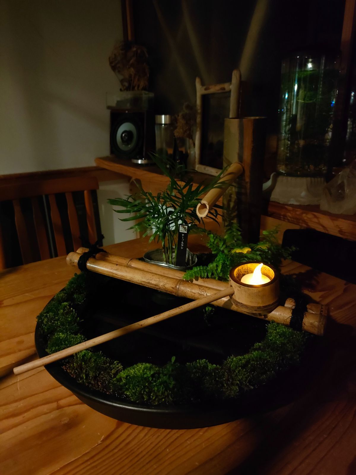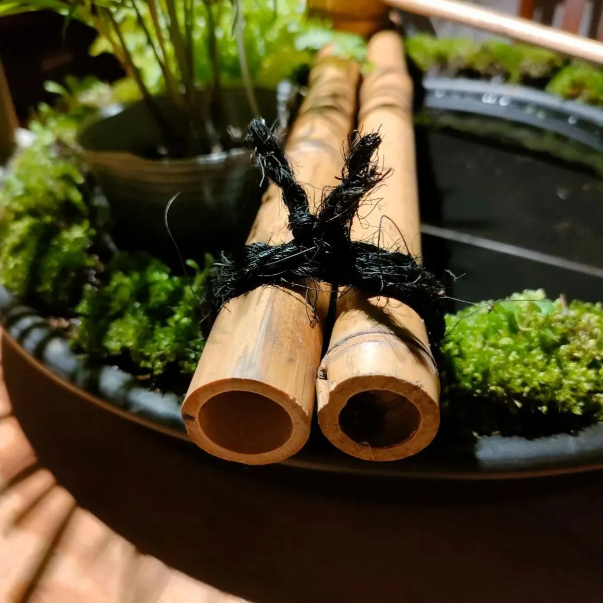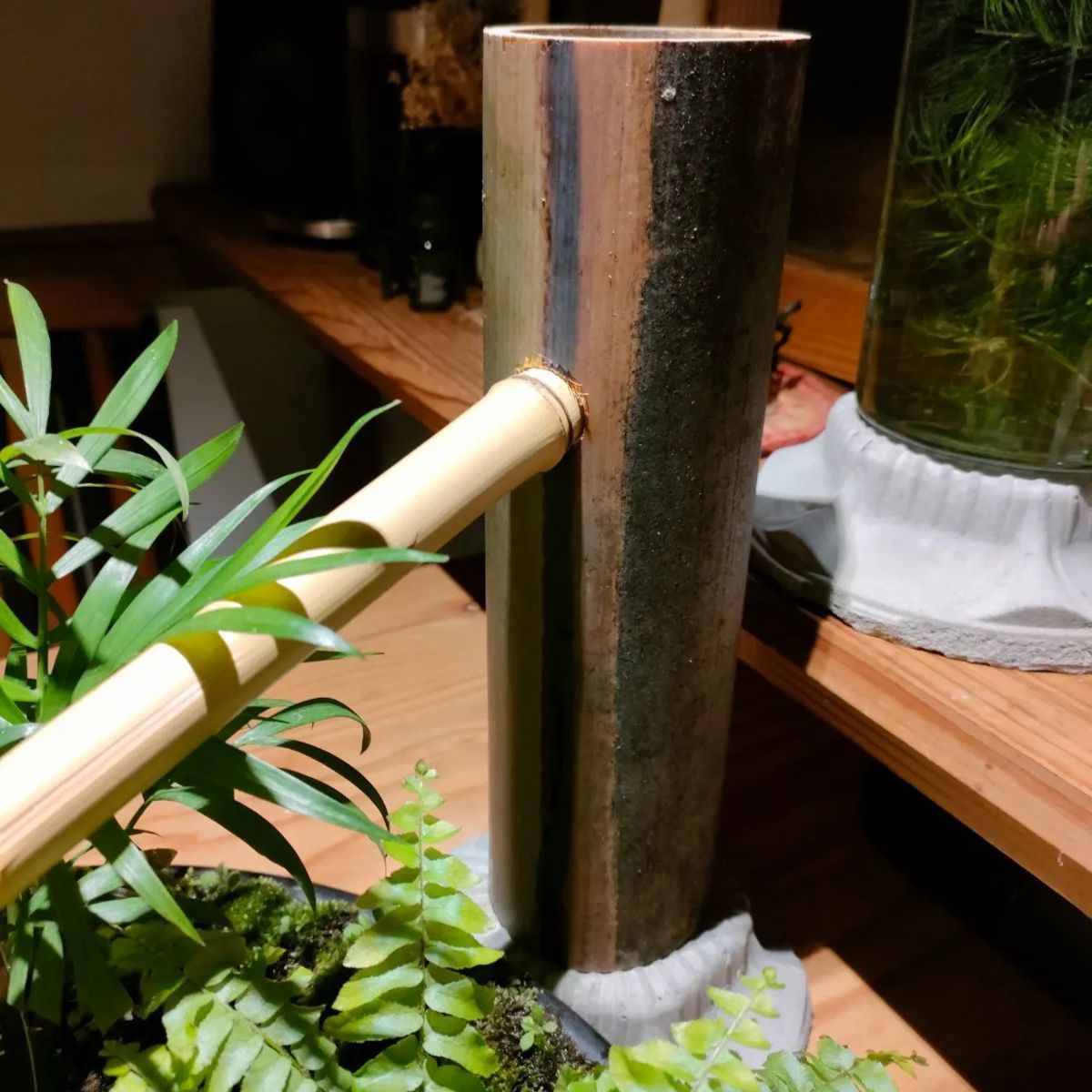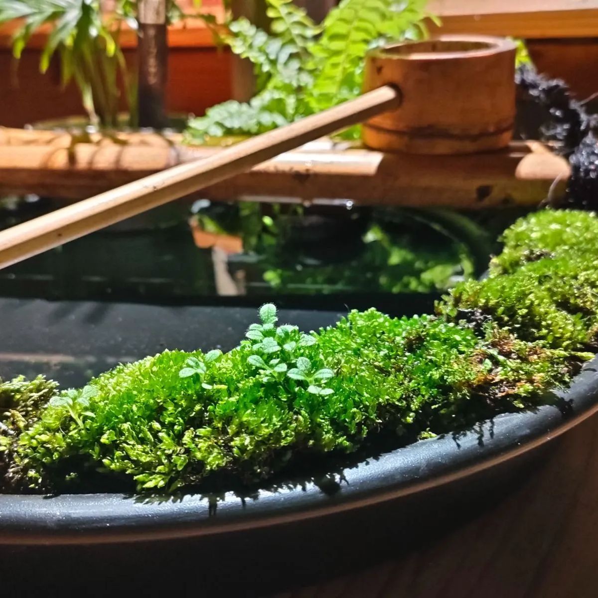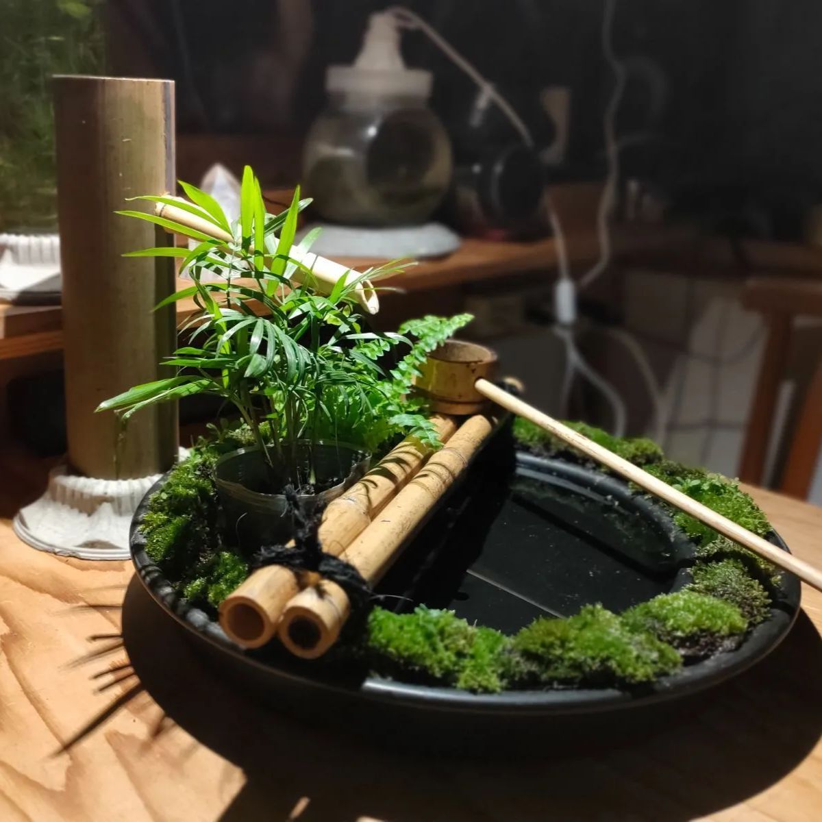→筧、柄杓、杓架、お皿に苔をセットした器に水草(アナカリス)、ミニ観葉植物2鉢(画像はテーブルヤシ+シダ類となっておりますが入手状況によって変更になる場合があります予めご了承ください。)