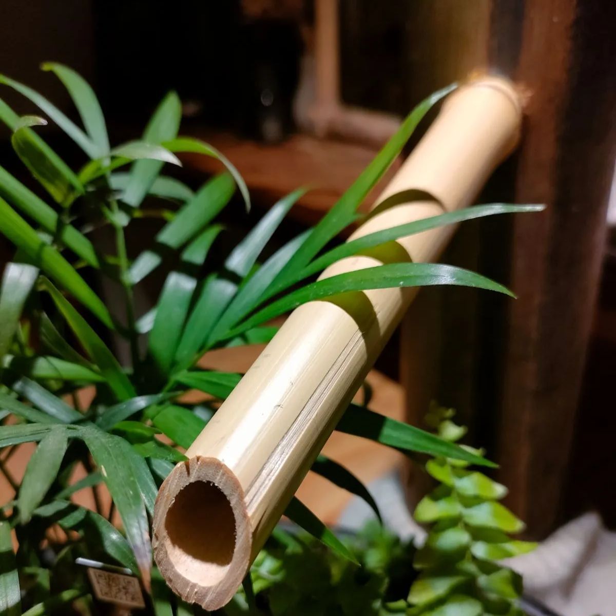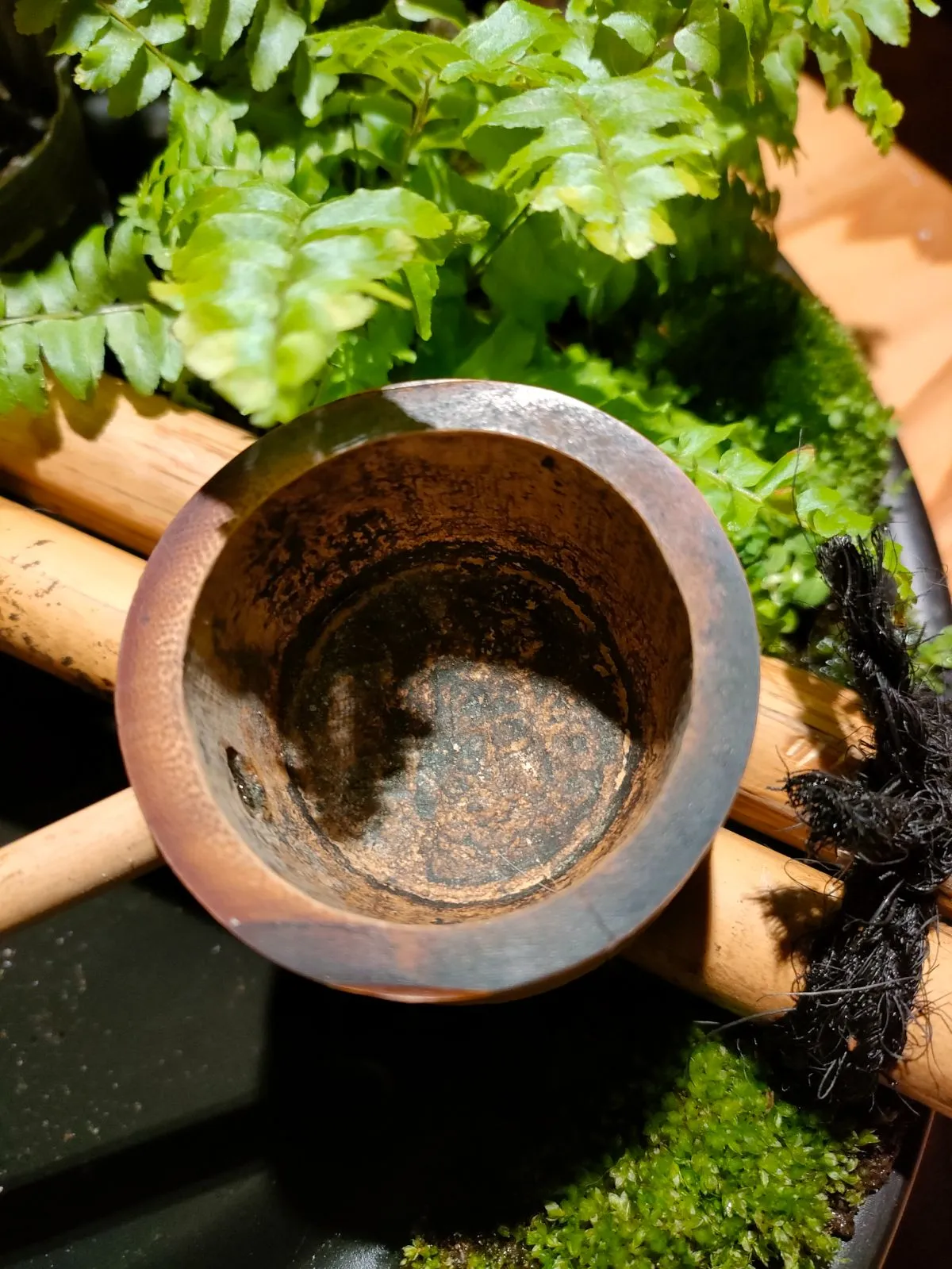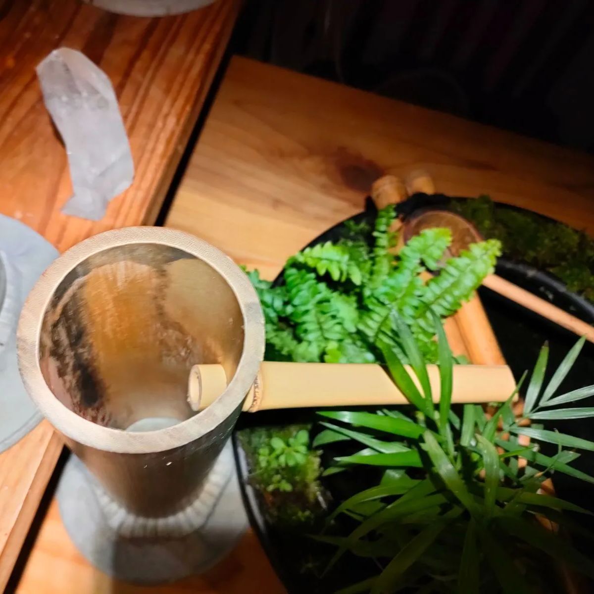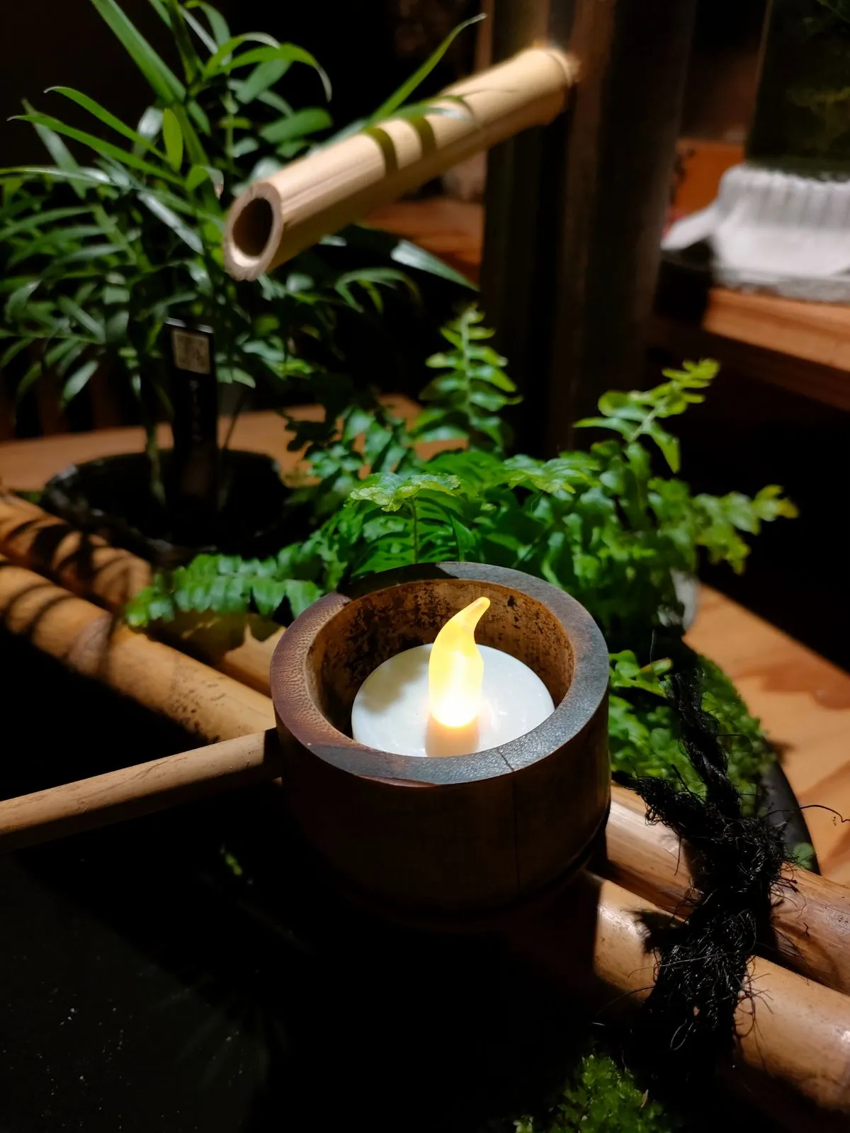 →筧、柄杓、杓架、お皿に苔をセットした器に水草(アナカリス)、ミニ観葉植物2鉢(画像はテーブルヤシ+シダ類となっておりますが入手状況によって変更になる場合があります予めご了承ください。)
