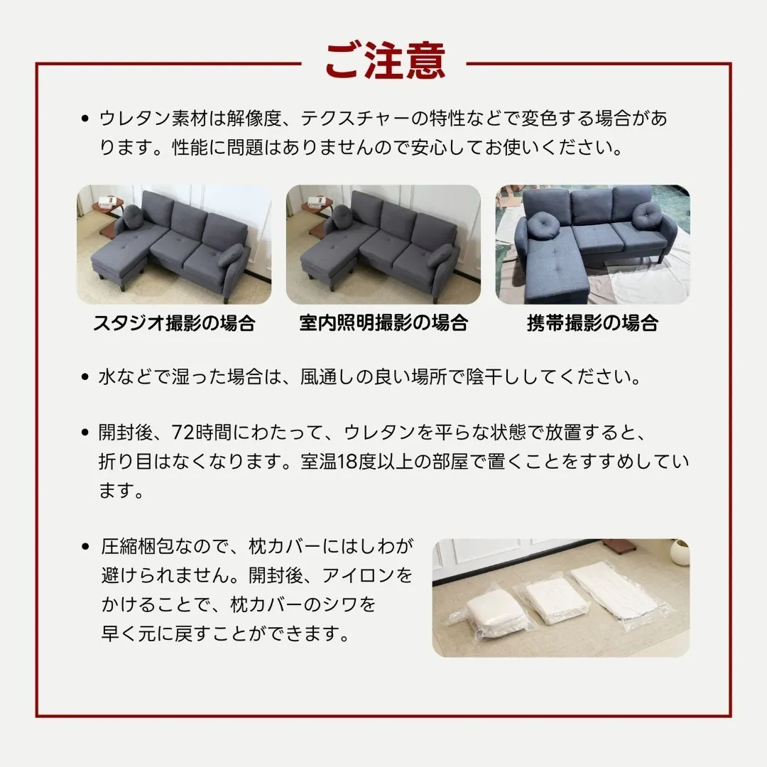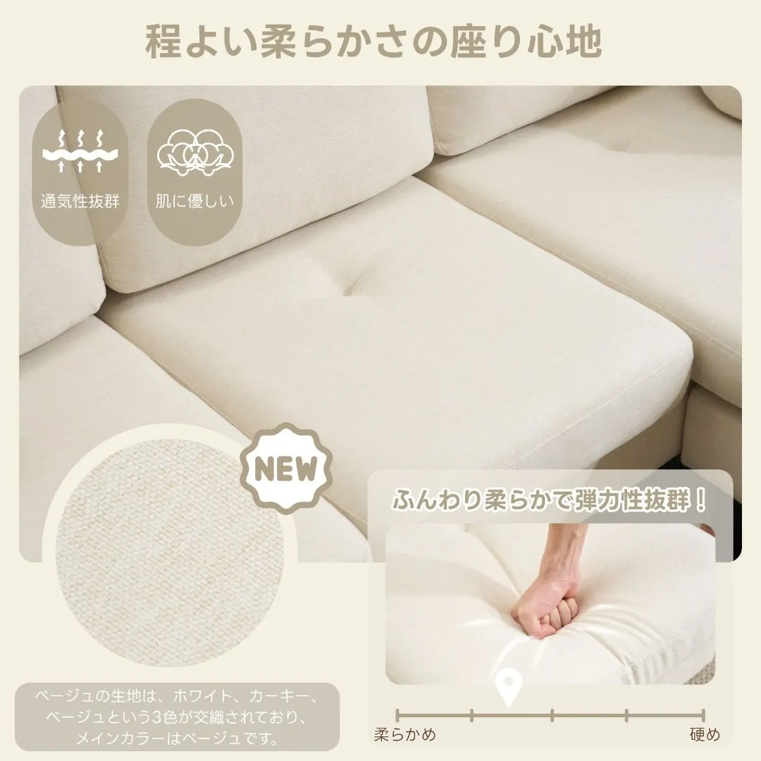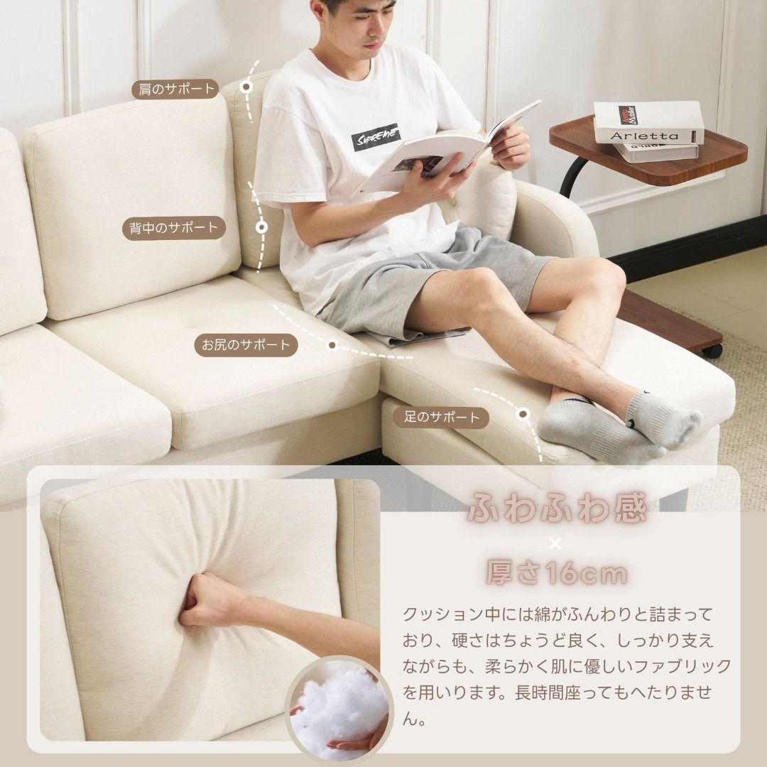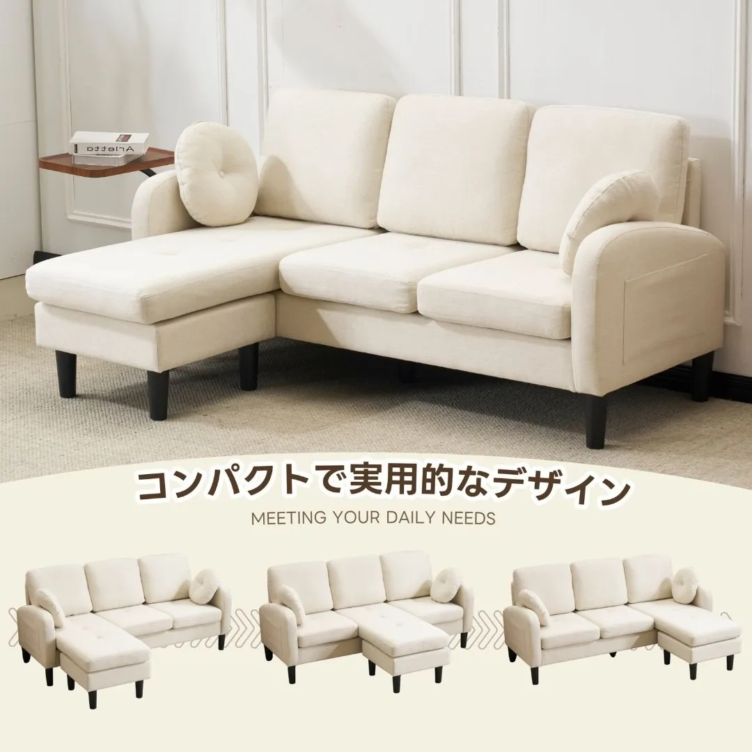 三人掛けソファ L型 ソファセット クッション付き コンパクト 高反発ウレタン ふわふわ インテリア 住まい 日用品 おしゃれ リビング オフィス 丸型クッション付き 滑り止めシート 肘掛け 取り外し可能 3色展開 アイボリー グレー