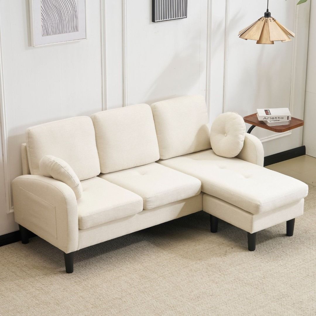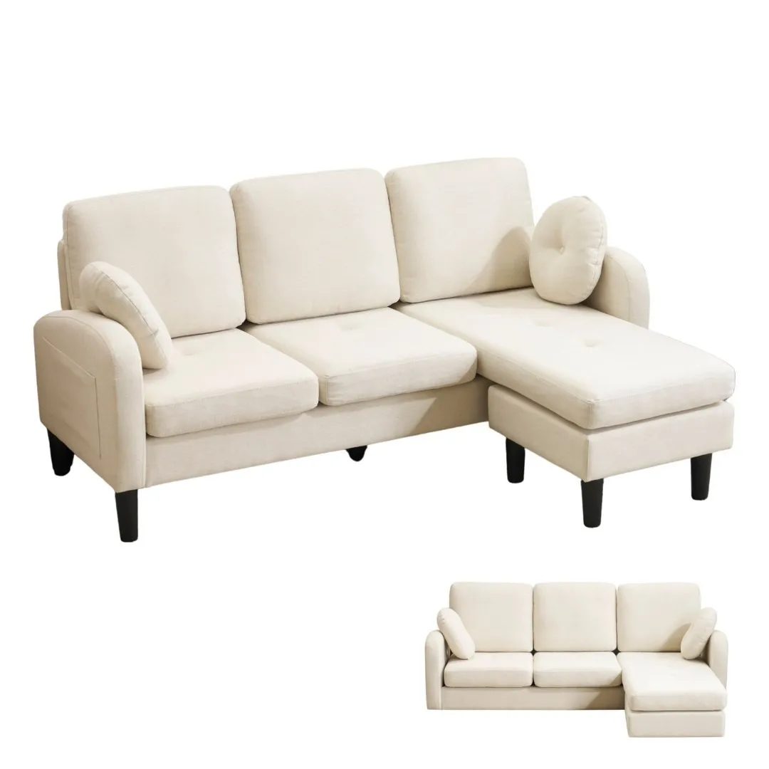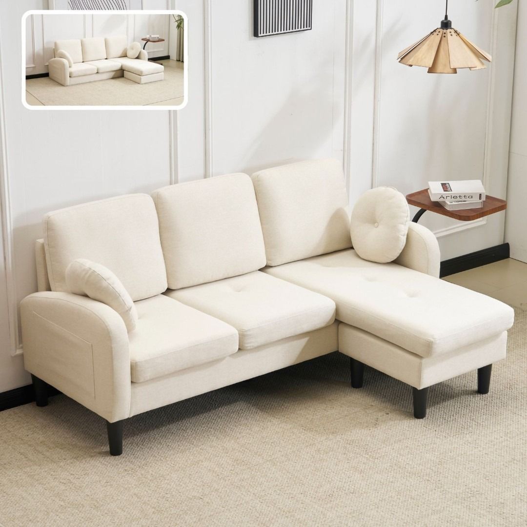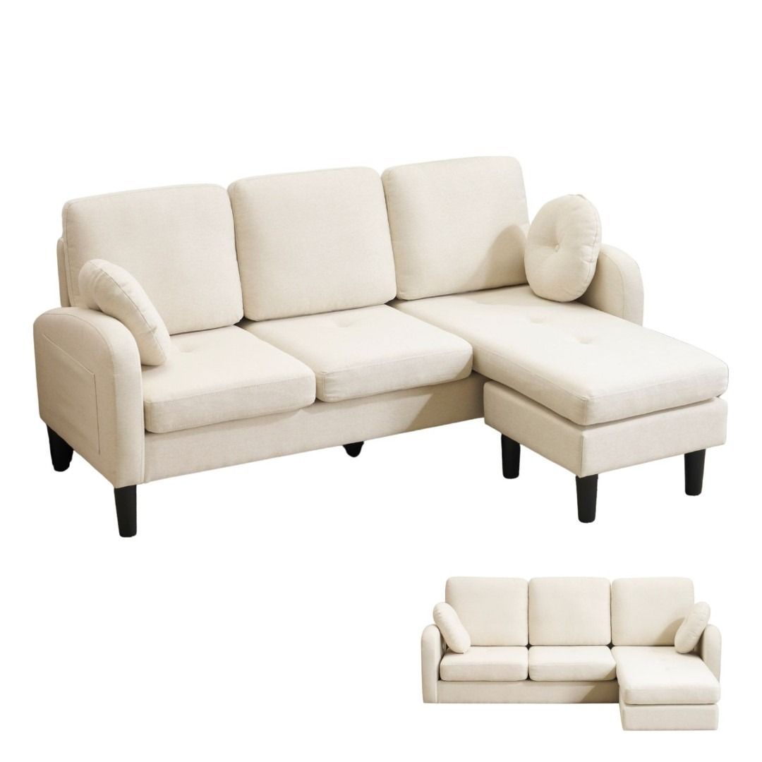 三人掛けソファ L型 ソファセット クッション付き コンパクト 高反発ウレタン ふわふわ インテリア 住まい 日用品 おしゃれ リビング オフィス 丸型クッション付き 滑り止めシート 肘掛け 取り外し可能 3色展開 アイボリー グレー