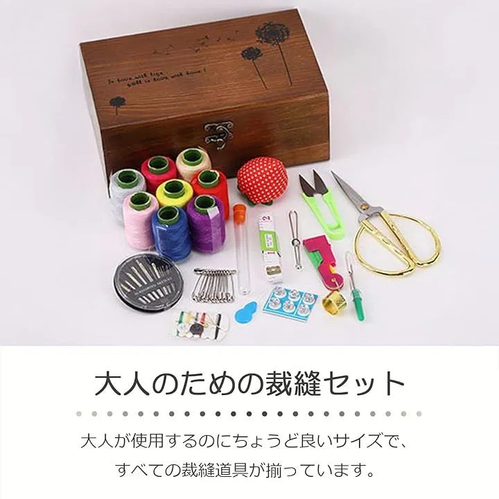 「大人のための裁縫セット」 このソーイングセットは、大人が使用するのにちょうど良いサイズで、すべての裁縫道具が揃っています。