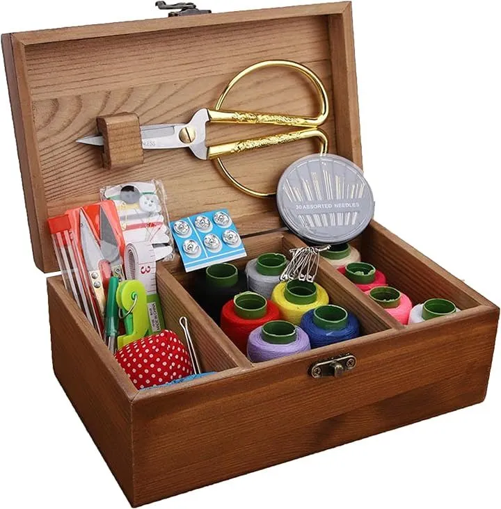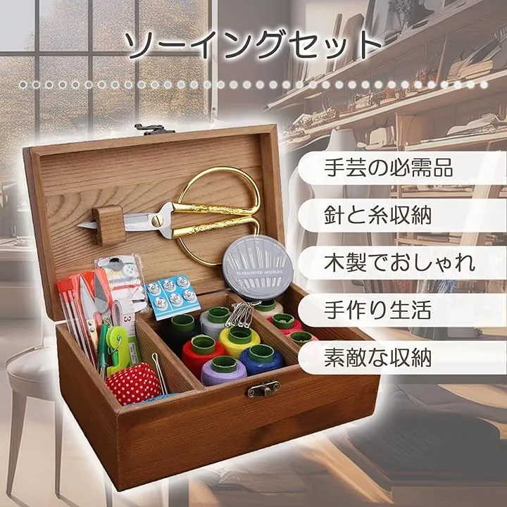 「便利な収納ケース」 ソーイングボックスは、木製の美しいデザインで、針や糸などの裁縫道具を整理整頓するのに便利な収納ケースです。