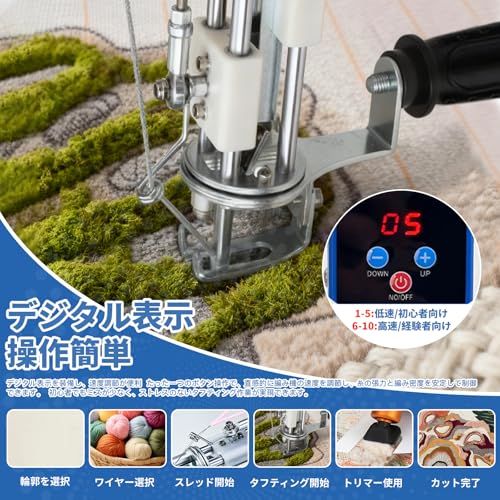デジタル表示で 操作が簡単:デジタルディスプレイ搭載で速度調整が一目瞭然。ボタン操作で直感的に編み機の速度を調節でき、糸の張りや編み密度を安定してコントロール可能。初心者でも失敗が少なく、ストレスフリーなタフティング作業が実現します。