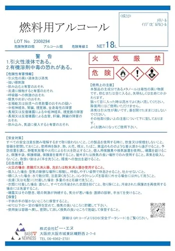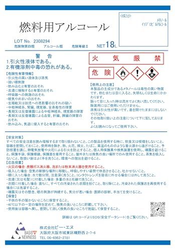 燃料用アルコール 注ぎ用ノズル付き 【大容量18L】 大容量 アルコールストーブ アルコールランプ ビー・エヌ 日本製 バーナー コーヒー沸かし (18 L)★m