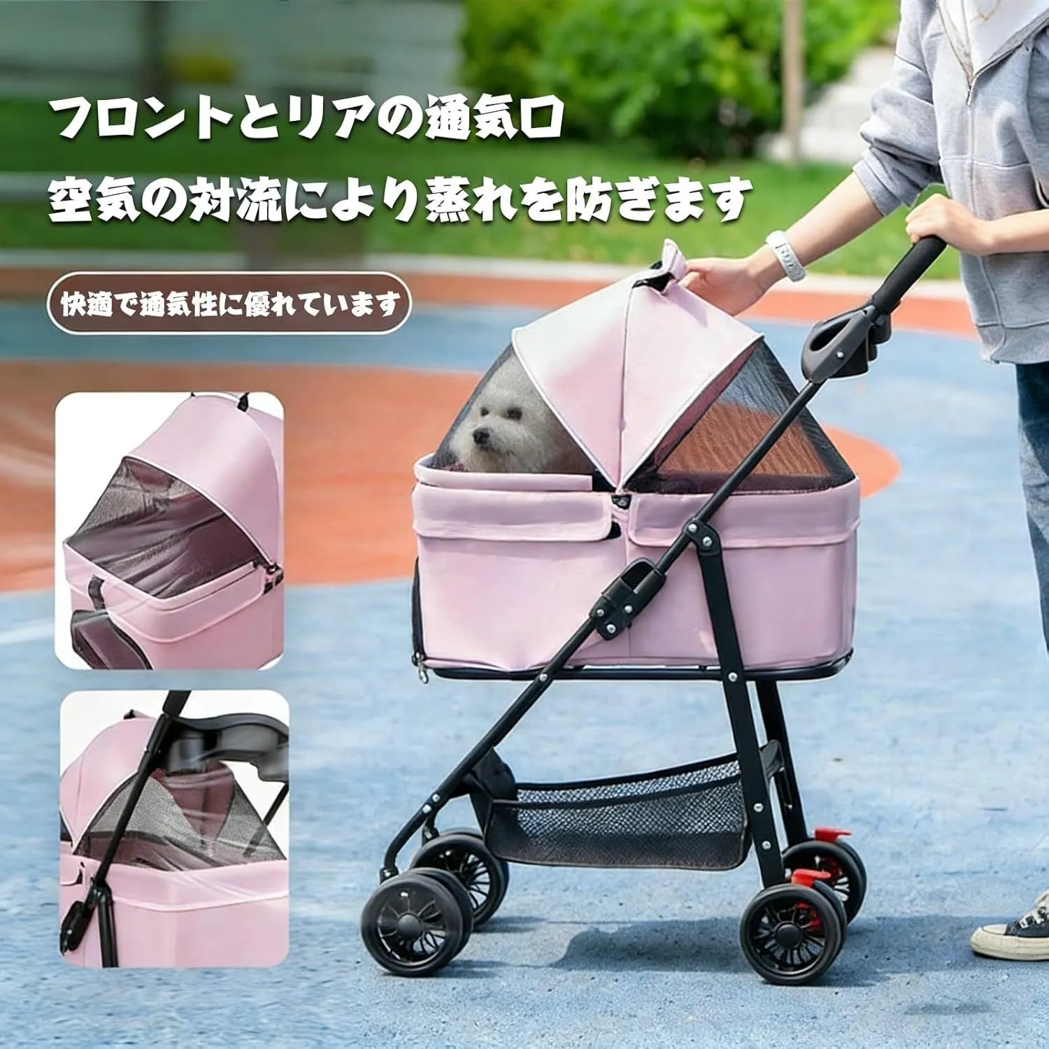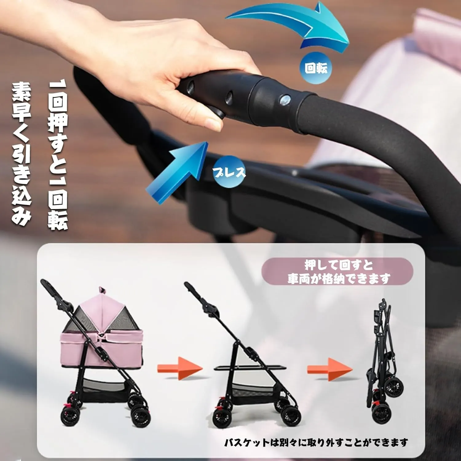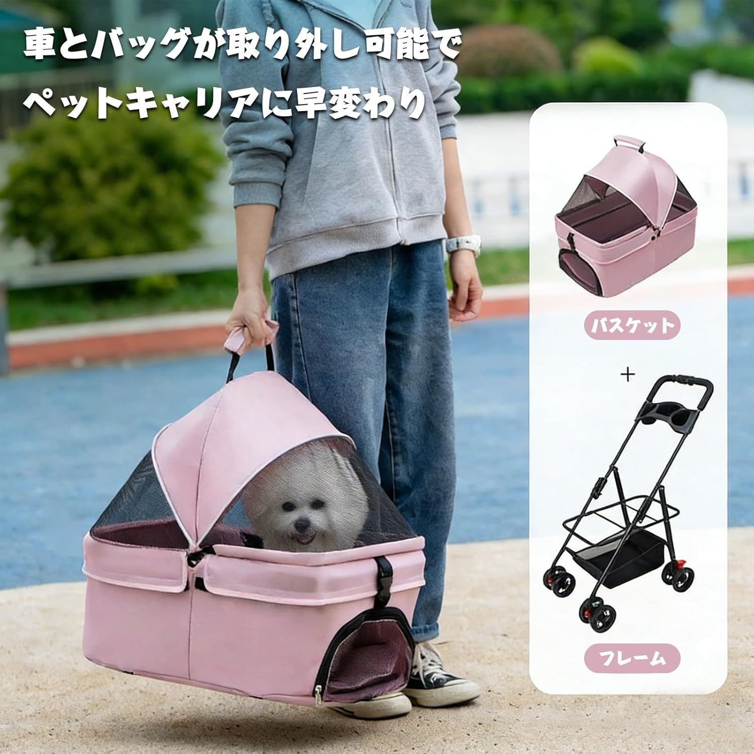 【分離型ペットカート】 キャリー部分が取り外しできる。ペットカート選びで重要なポイントです。ペットと一緒にでお出かけしたい方には必須条件となります。幅広いシーンで活躍します。移動はもちろん、ドライブボックスや簡易ハウス代わりとしても使えて、ペットとのお出かけがますます楽しくなります。