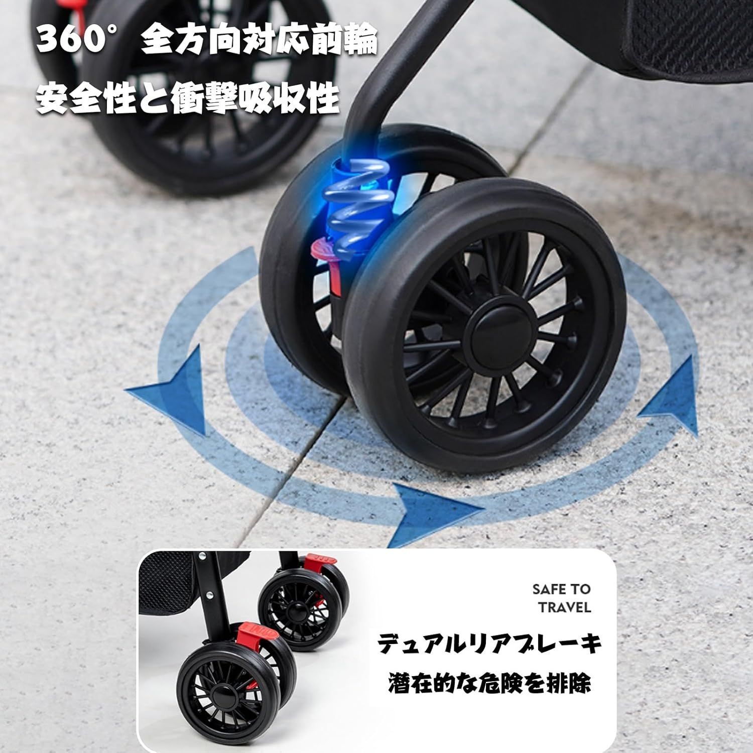 【4輪360°回転&ブレーキ付き】 4輪はいずれも360度回転でき、いつでも方向を固定することができ、4輪はすべてブレーキを持っており、回転とブレーキはすべてワンクリック操作である。操作が簡単で便利でです。石スラブ道路、速度制限バー、などあらゆる道路に適しています。