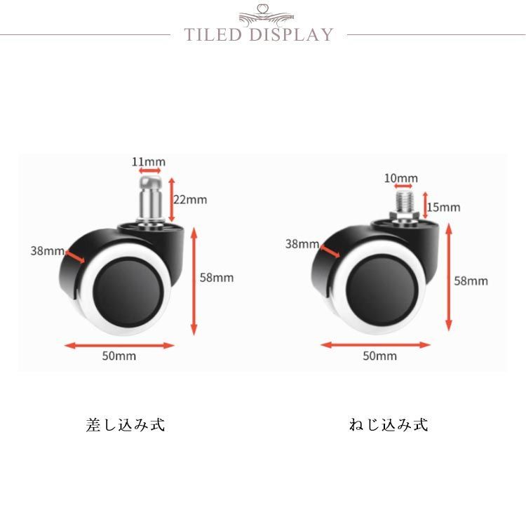 【ねじ込み式】ホイール直径:50mm ねじ込み口径:10mm ※サイズ計測には誤差が生じます。 素材:PU ウレタン 色:差し込み式 ねじ込み式 5個入り!差し込み式・ネジ込み式の2タイプ!オフィスチェア交換用キャスター。 フローリングの床にキズが付きにくいウレタン巻きの双輪キャスターです。 小型でシンプルなデザイン、取り付け簡単。 キャスターが破損した時の交換用に便利です。 オフィスチェア、パソコンチェア、学習チェアなど、ほとんどのイスに対応することが可能です。