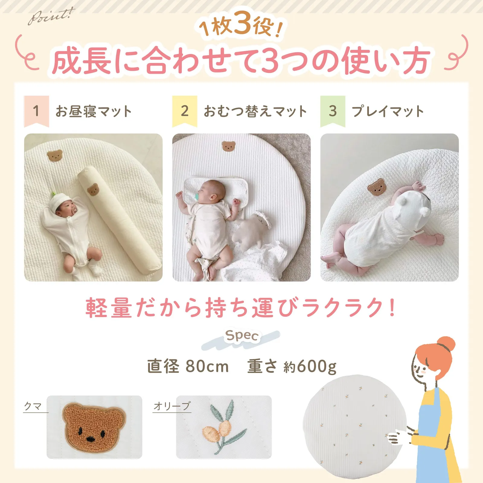新品 【インテリアコーディネーター推薦】 ベビーマット プレイマット 赤ちゃん マット 円形 月齢フォト 直径80㎝ ファスナー付き 綿(クマ)