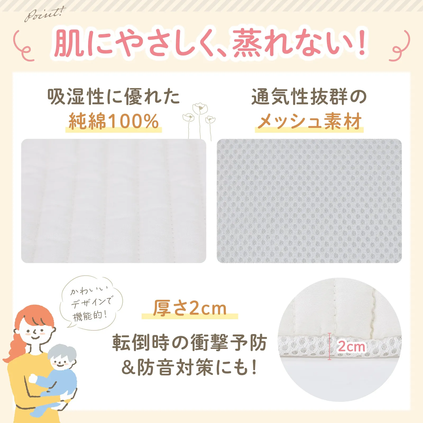 【商品説明】このベビーマットは、ぽこぽこ感が可愛い綿100%まんまるマットです。赤ちゃんの遊びやおごろ寝にぴったりなアイテムです。