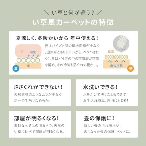 【組成】 表面:ポリオレフィン系複合樹脂(主原料:ポリプロピレン) 紋織 縁:麻54%・綿46% 四方縁