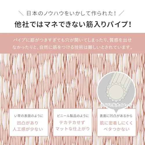 【備考】 水洗いできます 水に強いポリプロピレン素材を使用したラグカーペット。飲み物などをこぼしても、サッと簡単に拭き取ることができます。また、水洗いできるので、小さいお子様やペットのいるご家庭にもおすすめです。パステルカラーが空間を可愛く包みます。 パイプの表面に筋が入っている筋入りパイプで、肌に密着しないからベタベタしにくく、汗ばむ季節にもおすすめです。また、パイプ内の空気層の保温効果で床からの冷気を防ぐため、寒い季節でもあたたかく過ごせます。