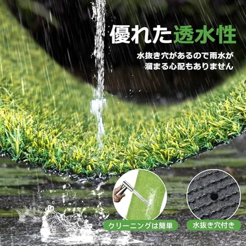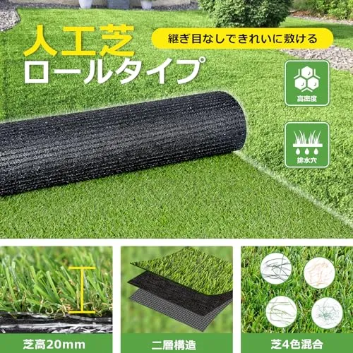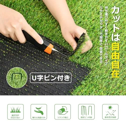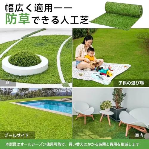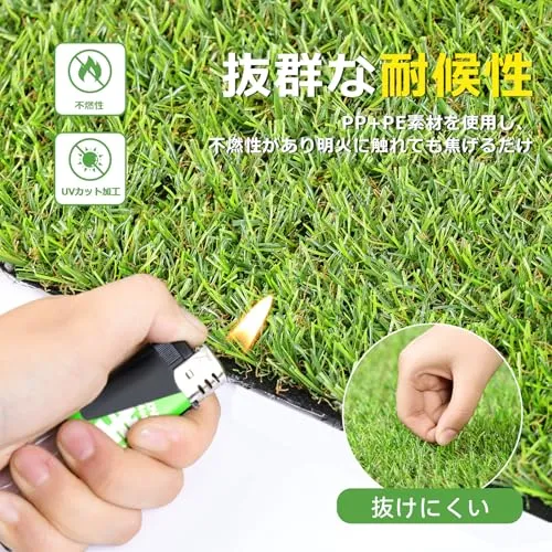 【通年使える耐久タイプ人工芝】本製品はオールシーズン使用可能で、買い替えにかかる時間と費用を削減します。 また、高温にも低温にも強く、UV加工により色あせしにくく長持ちします。さらに、光沢のあるポリプロピレン素材が人工芝を輝かせます。安全性を確保しながら、お庭を引き立てる防炎人工芝です。