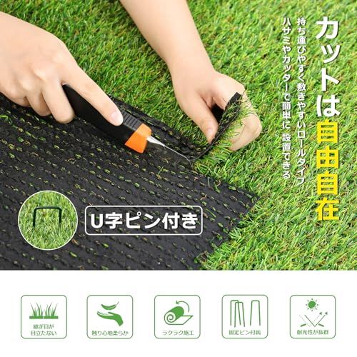 【幅広く適用/お手入れやすい人工芝】庭、ベランダ、バルコニー、テラス、屋根などの屋外やエントランス、幼稚園、店舗、室内駐車場などの屋内に適しています。屋内のフロアマットやカーペットとしても使用できます。取り扱いが簡単、ハサミを差し込むとサクッと切れます。長さが20mmと短いので掃除がしやすく、汚れは水洗いできます。