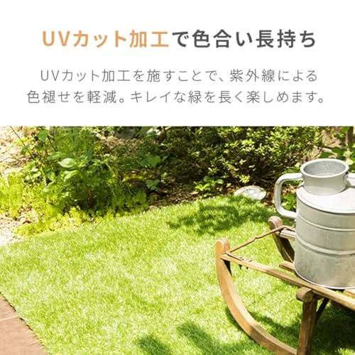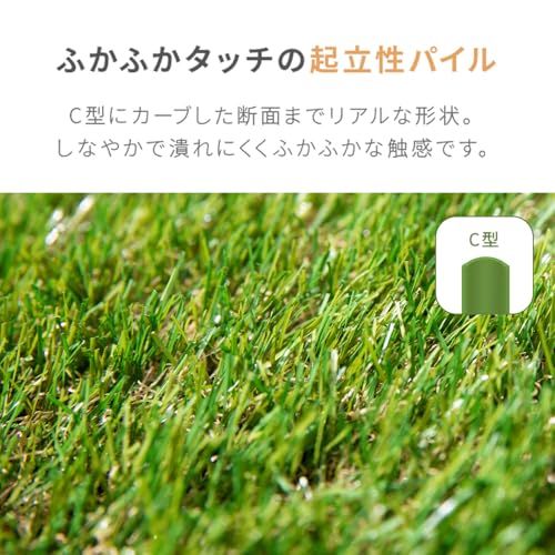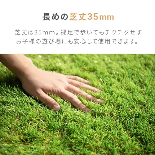仕様・スペック サイズ:約 1m10m(毛足35mm) / 材質:表面…ポリエチレン樹脂 裏面…ポリプロピレン樹脂 / 特徴:高耐久、2層構造、水抜き穴、高密度、つや消し加工、UVカット加工、低ホルムアルデヒド、簡単設置、固定用U字ピン付き