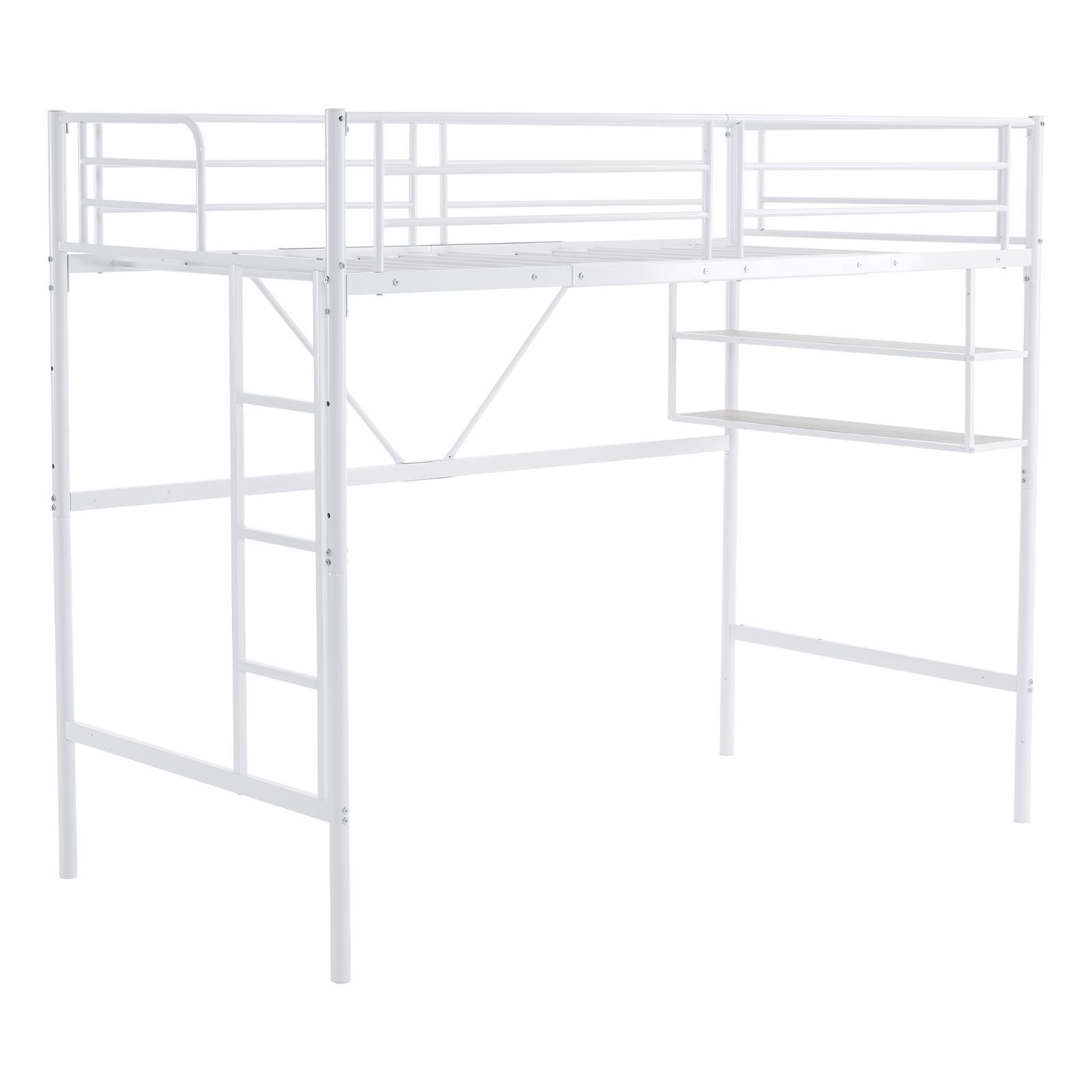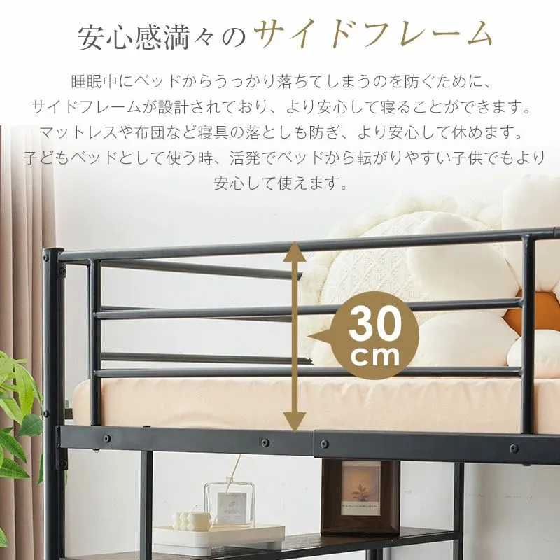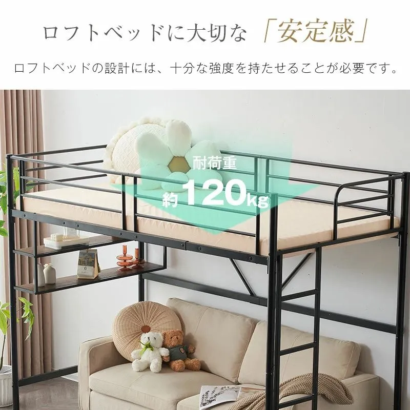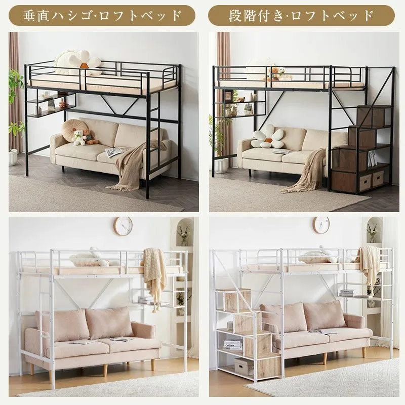 タイムセール!ロフトベッド サイド棚付き シングルサイズ 北欧風 スチール製 省スペースで下収納に便利 BLACK✕WHITE