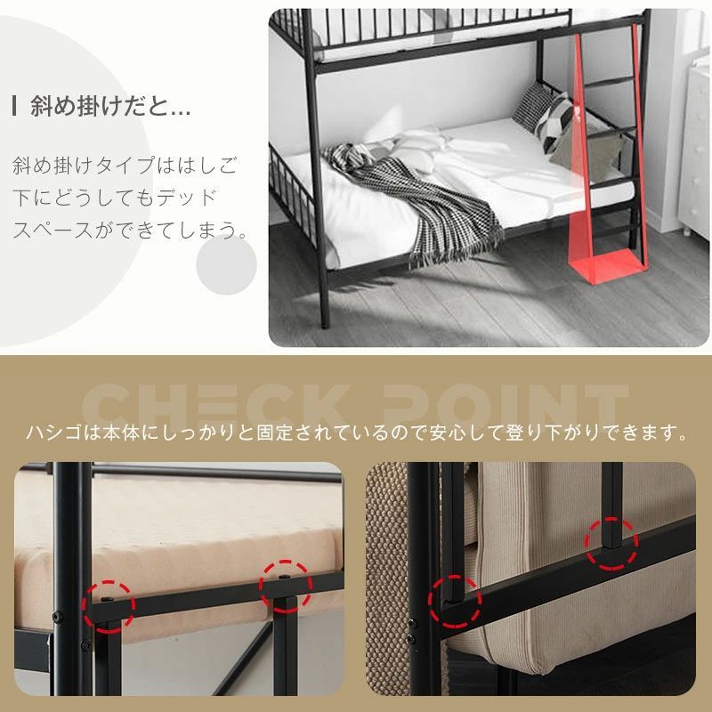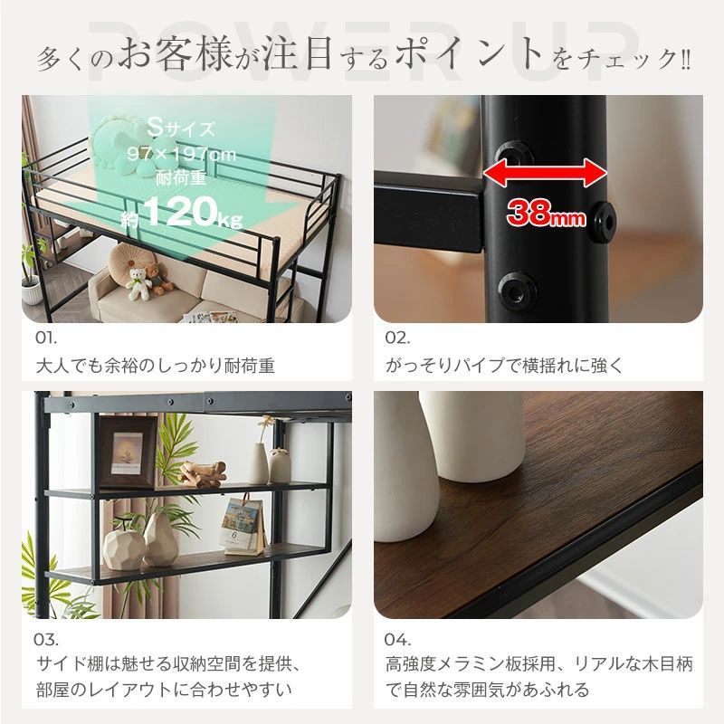 【おススメポイント】 1.高効率な空間利用、垂直ハシゴ・ロフトベッド。小さなスペースでも快適な居住環境を実現します。ハシゴでのアクセスは簡単で安です。上部にベッドスペース、下にデスクや収納スペース配置します。勉強や作業、睡眠などを効率的に組み合わせます。シンプルなデザインと洗練されたスタイルでお部屋にモダンな魅力を演出します。さらに、特筆すべきは楼梯が左右に可替換という機能です。部屋のレイアウトや設計に応じて、楼梯の配置を変えることができます。これにより、お部屋のデザインにより一層フィットし、使い勝手の良いスペースを自在に創り出すことができます。 2.置物棚付きのロフトベッドは追加の収納スペースを提供します。本や文房具、スマホ、メガネ、目覚まし時計などの小物もなどを整理整頓できます。快適な寝室環境を作り出し、必要なアイテムを手元に置いて便利に使えます。 3.高強度メラミン板採用で、耐久性と耐摩耗性に優れ、長期間の使用にも安心です。リアルな木目柄は、自然な雰囲気を演出し、お部屋に温かみと居心地の良さをもたらします。木目の美しい質感は、自然の風合いを再現し、心地よい空間を創り出します。さまざまなインテリアスタイルにマッチし、お部屋の雰囲気を引き立てます。さらに、メラミン板のお手入れも簡単で、汚れや傷を防ぐことができます。 4.脚床面が高くなっているため、下の空間が通気性がよくなり、湿気やカビ、ダニの繁殖を防ぐことができます。さらに、重量を分散することで、安定感が増し、より安心してご使用いただけます。 5.ベッドは、16本の支柱を使用してしっかりと支えられており、安心感が満ちています。