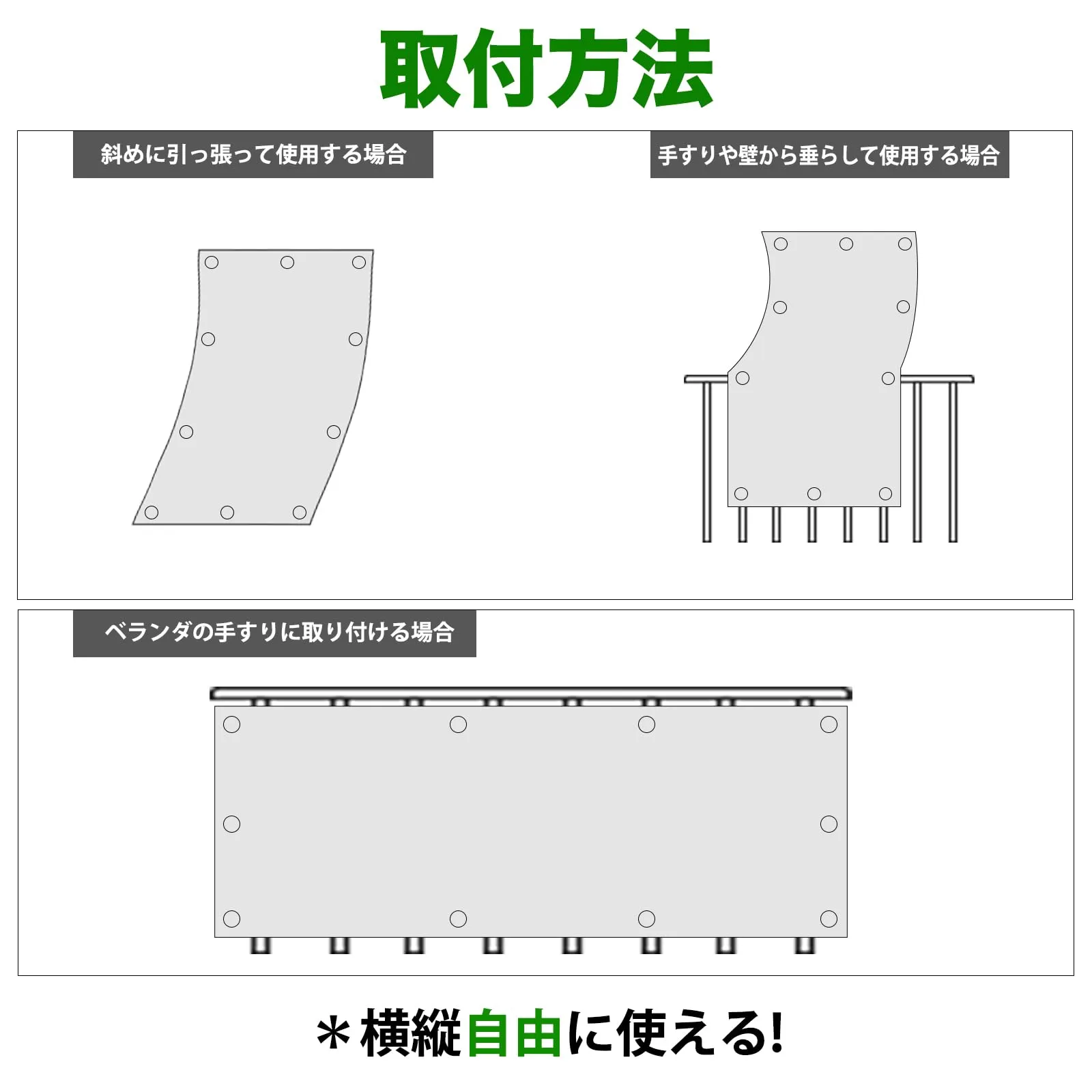 「適用場所」サンシェードは屋外で使用されることが多く、バルコニー、庭園、テラス、駐車場、ビーチ、キャンプ場、などで日除けや遮光として利用されます。