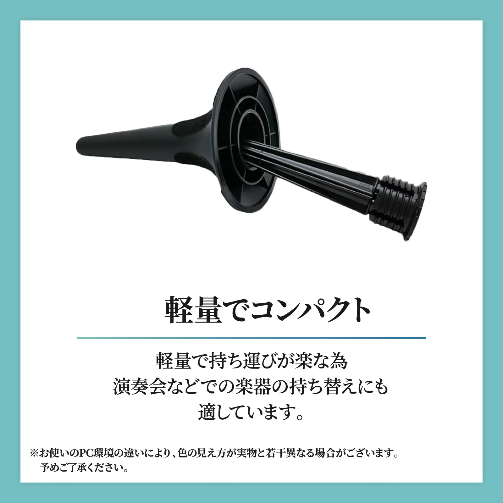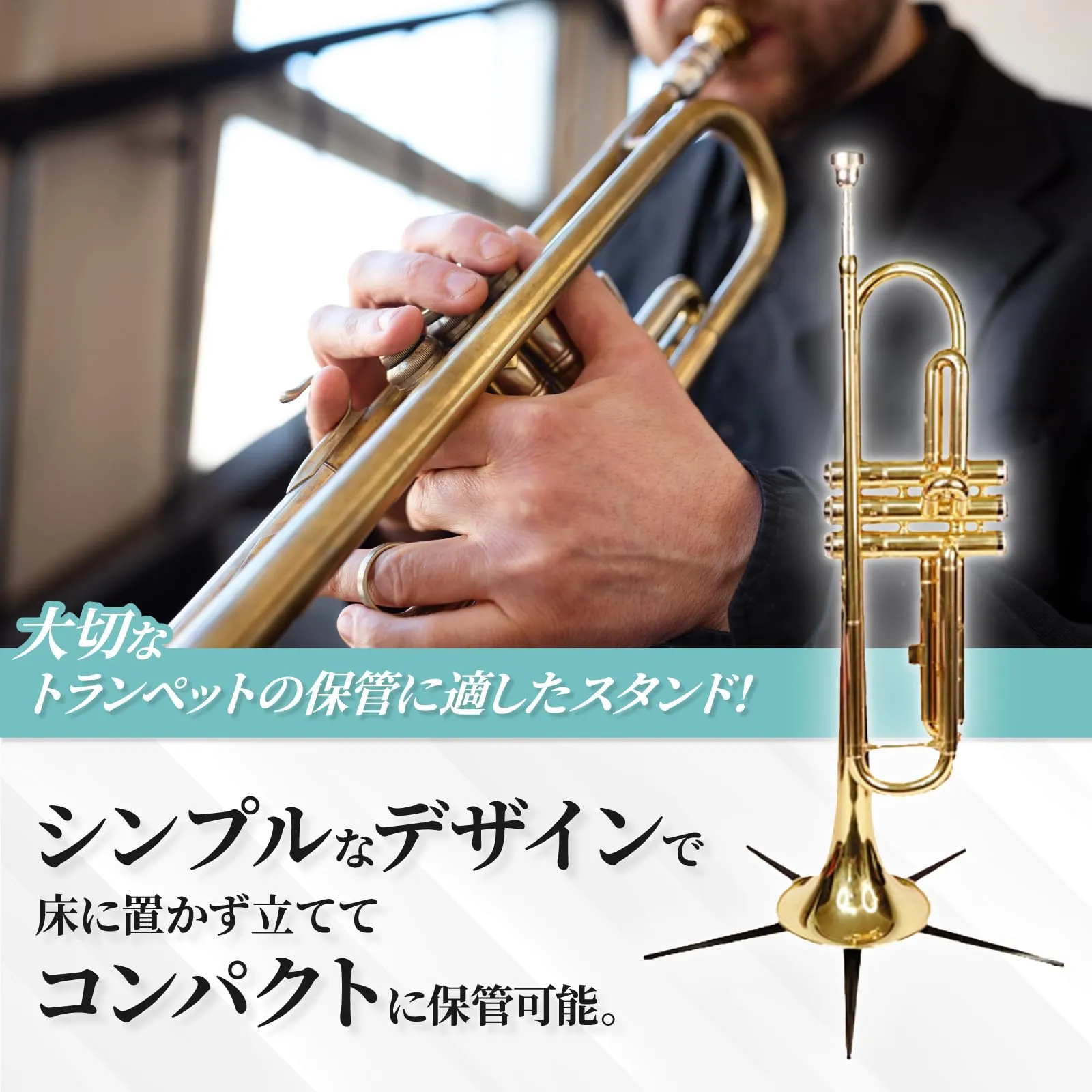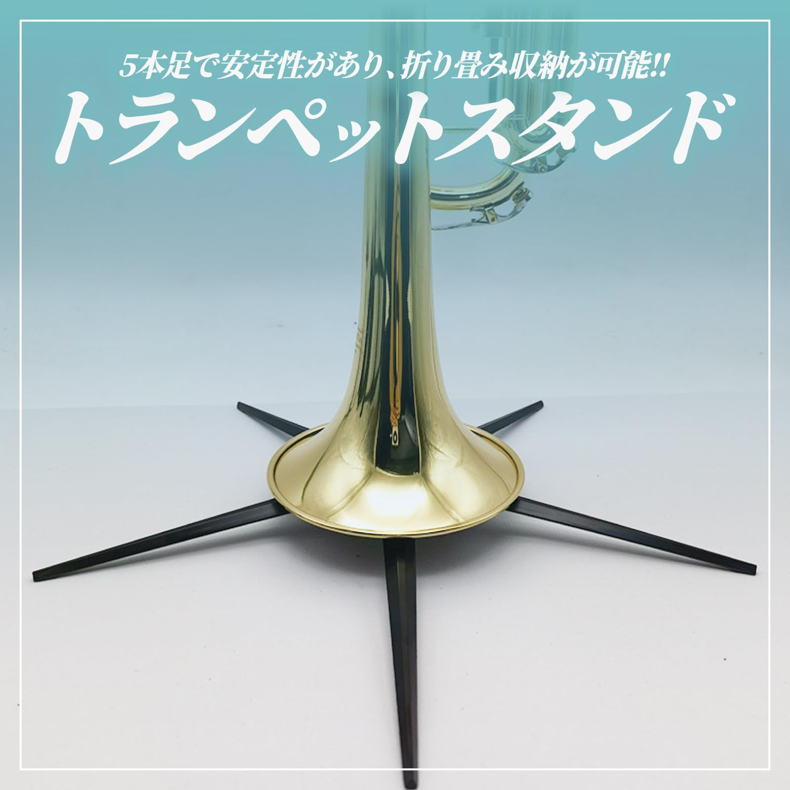 スタンドの足は折りたたみ可能でトランペットのベル内に収納できます。軽量コンパクトで持ち運びの際にスペースを取らないポータブル仕様です。