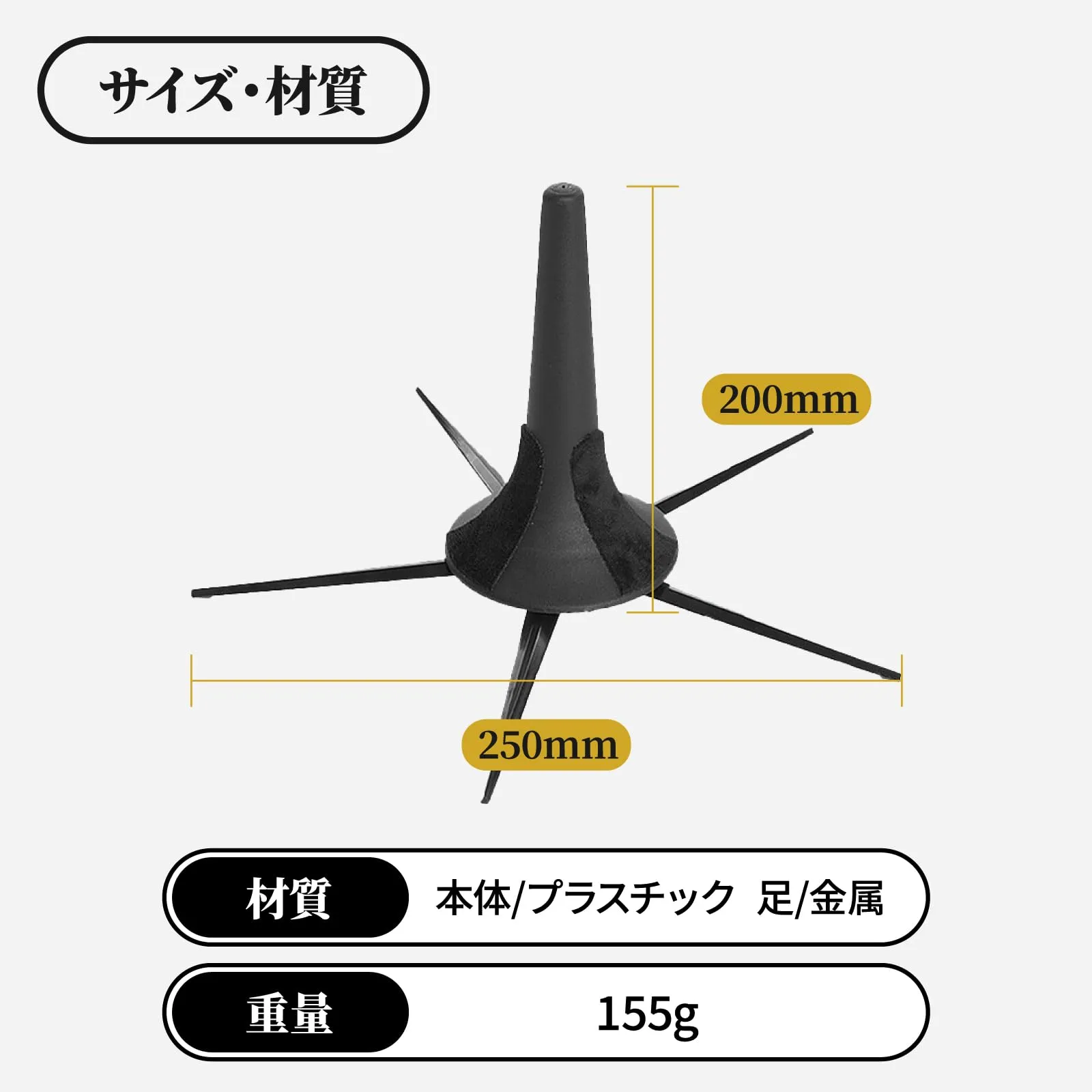 シンプルなブラックカラーのデザインで安定感のある5本脚仕様のトランペットスタンドです。本体にはプラスチック、5本足には金属を採用しており、軽量と安定性を両立。