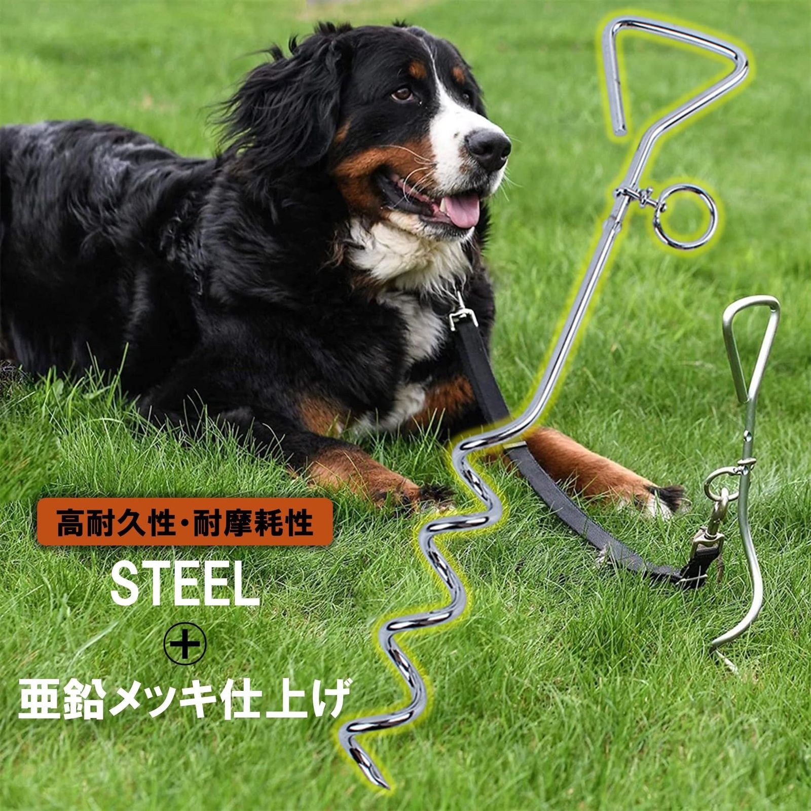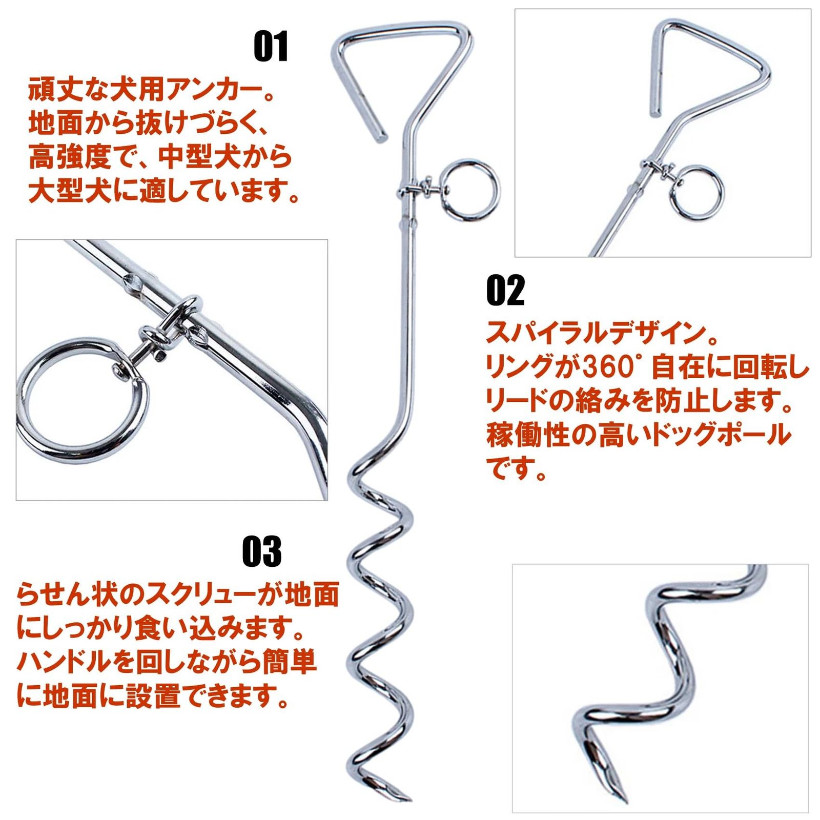 スクリューペグ上部にはリードを取付けるスパイラルリングが装備され、リングが360°自在に回転しリードの絡みを防止します。ワンちゃんの稼働性と自由度が高いドッグポールです。頑丈な犬用スクリューペグは、地面から抜けづらく小型犬は勿論、中型犬から大型犬に適しています。※土質、愛犬の力や動きなどでペグが抜ける場合もあります。予めご了承ください。