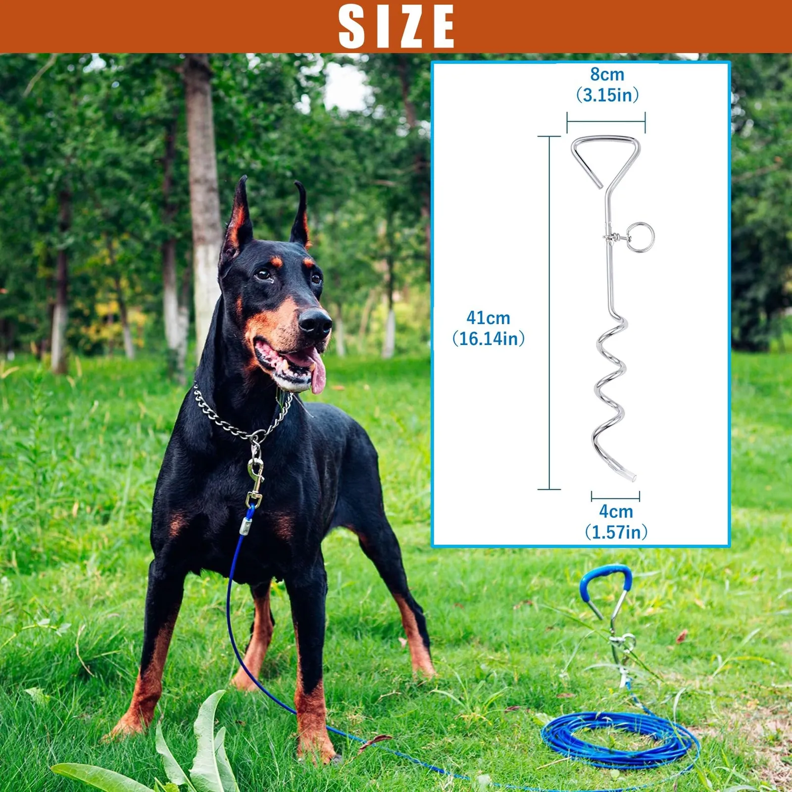 スクリューペグのサイズは全長41cmとなっており、地面の奥深くまで挿入設置することができますので、抜けづらく安定して愛犬を係留しておくことができます。設置手順は、スクリューペグを地面に垂直に置き、次にハンドルを持ちます。スクリューペグを時計回りにゆっくりと土に押し込んで挿入します。
