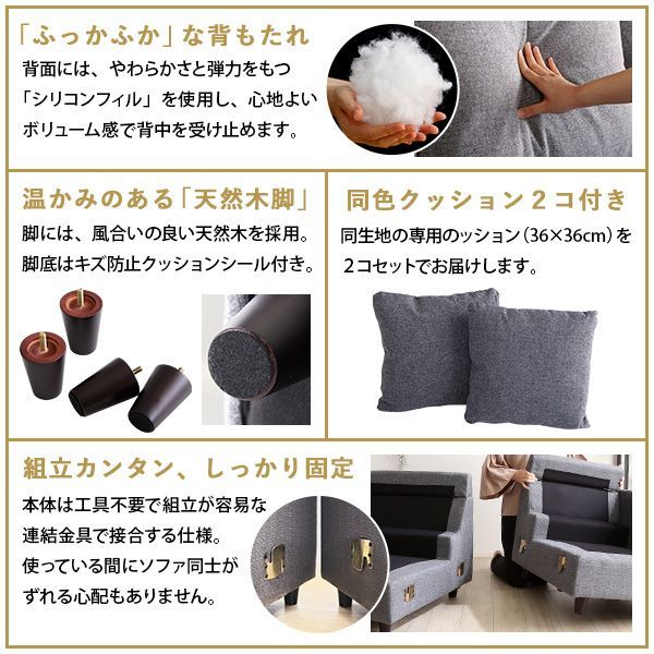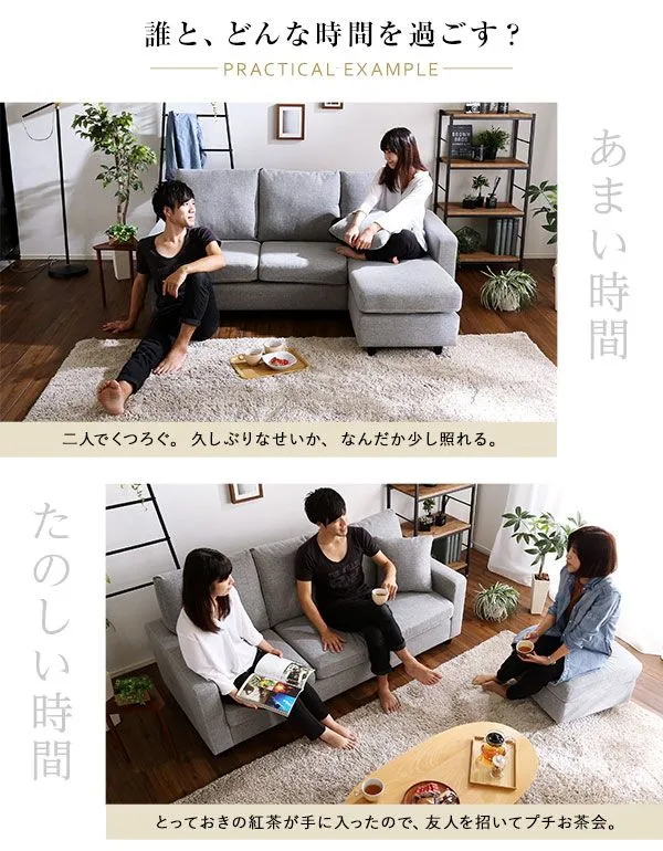 スツールと座面の位置を入れ替えるだけで、簡単にスタイルチェンジできるゆったり3人掛けソファです。