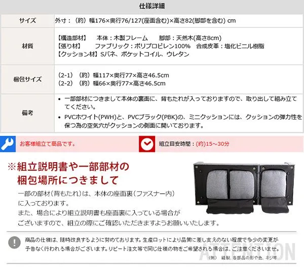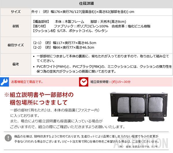 【張り材】 ・ファブリック:ポリエステル 100% ・合成皮革:塩化ビニル樹脂
