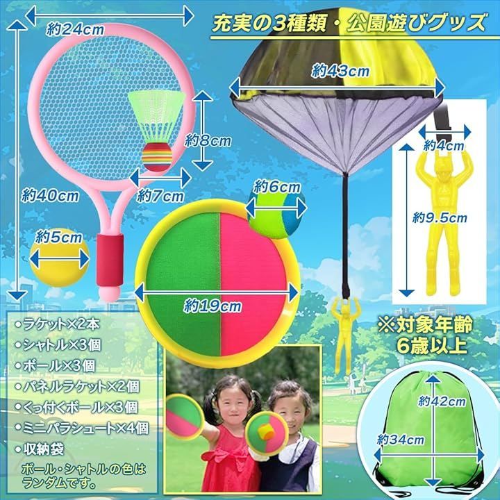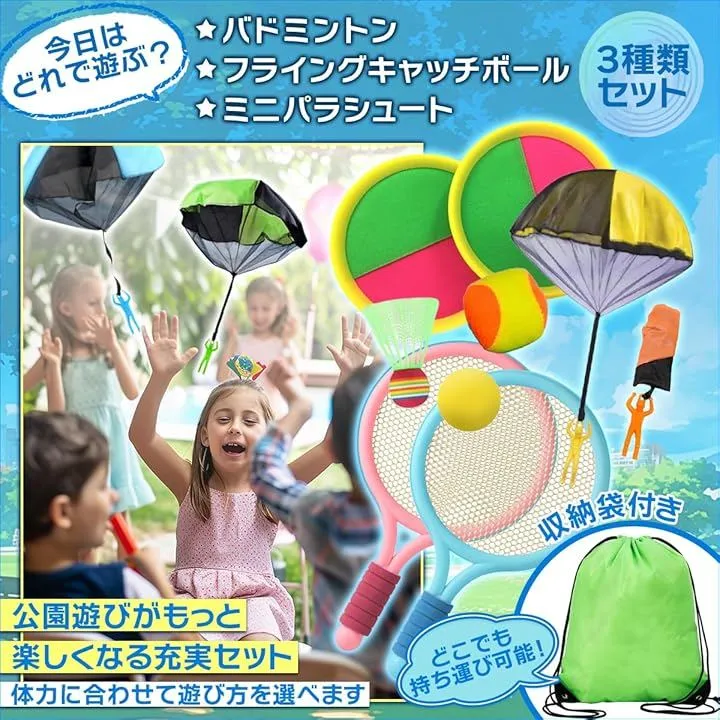 「まとめて持ち運び。公園遊びが広がる便利な収納袋付き」 バドミントン、パラシュート、キャッチボールをすべて収納できる専用袋付きで、公園や広場への持ち運びもスムーズ。
