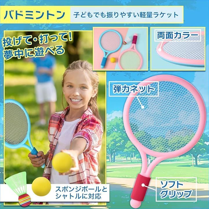 「親子で本格外遊び。安心サイズのバドミントンセット」 子ども向けサイズ設計で初めてのバドミントンでも扱いやすく公園遊びに最適です。
