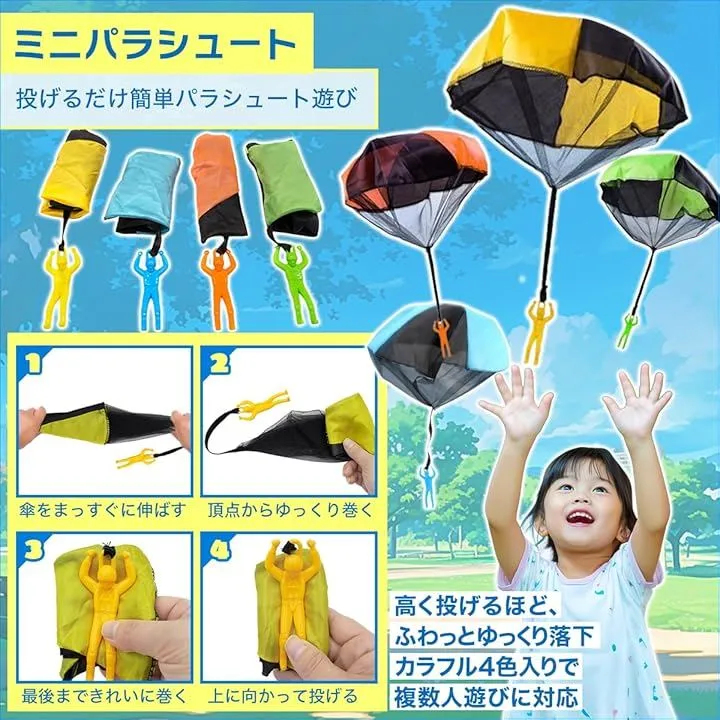 「投げて待つワクワク体験。想像力を育てるミニパラシュート」 開くと直径約43cmのパラシュートと約4x9.5cmの人形が、空からゆっくり舞い降りる楽しい仕組み。