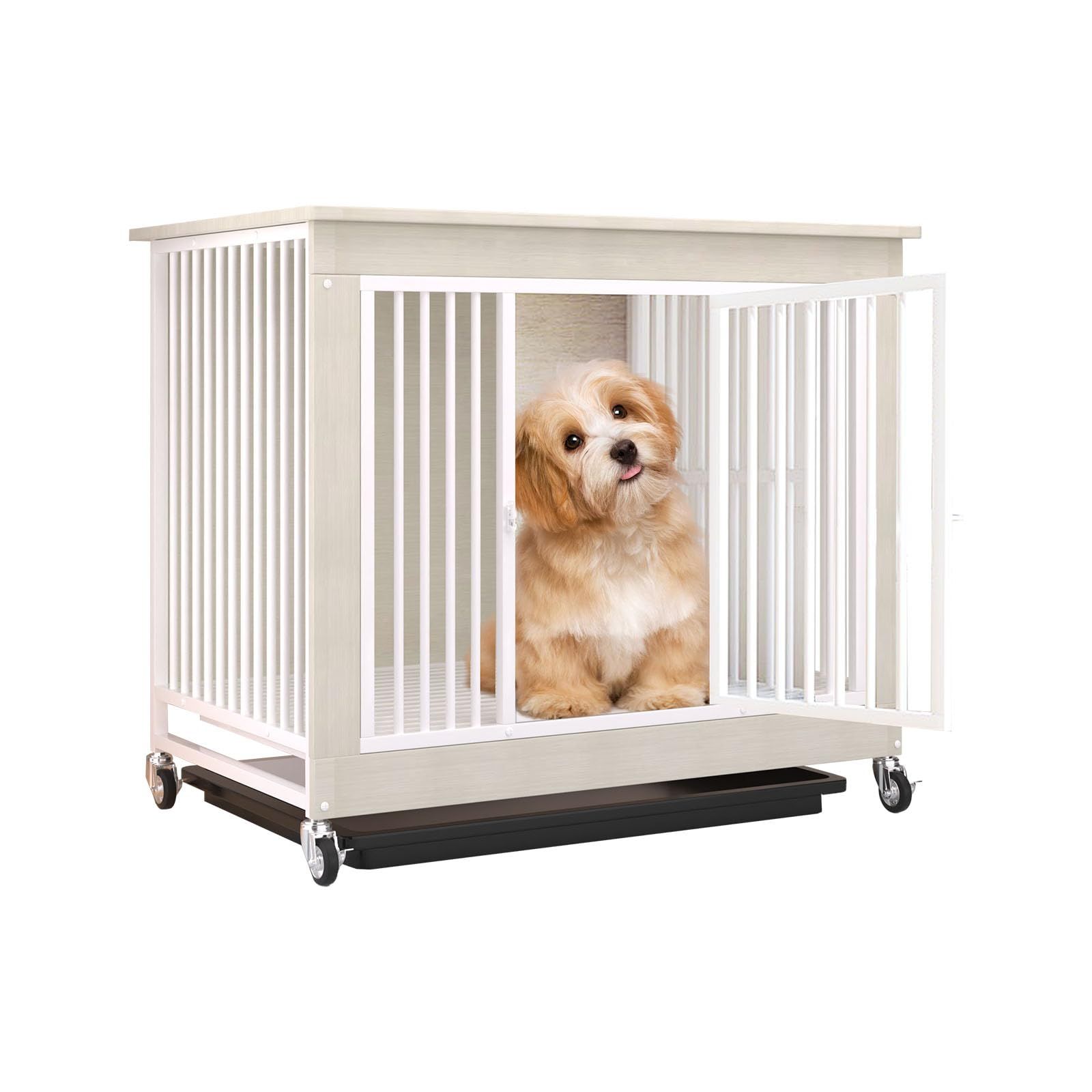 犬ケージ 小型犬 屋根付き ウッディサークル 犬小屋 中型犬 キャスター付き 木製 トレー付き 幅 80×奥行52×高さ77cm(ホワイト, S)