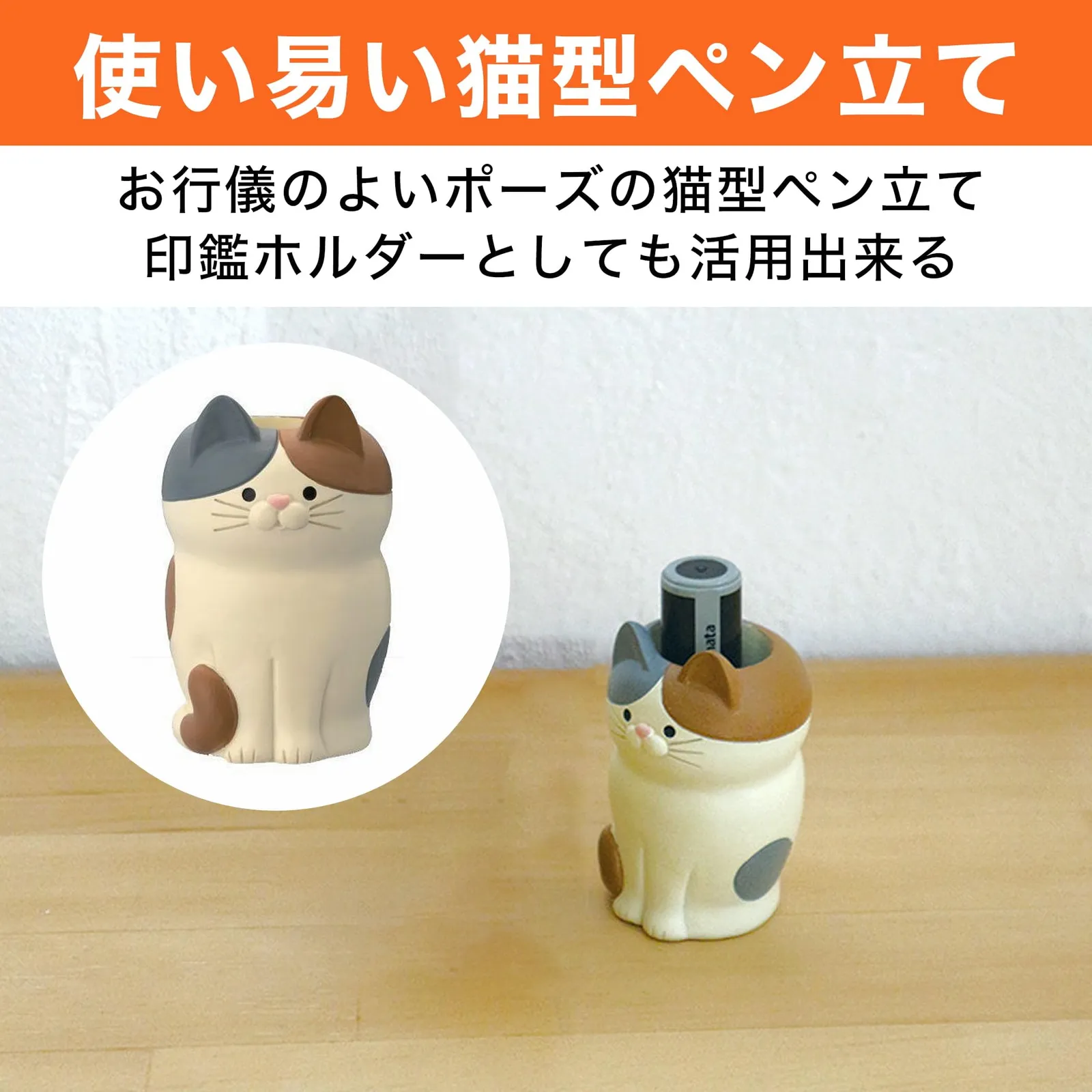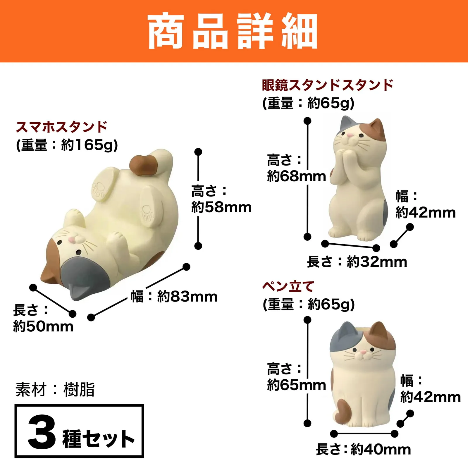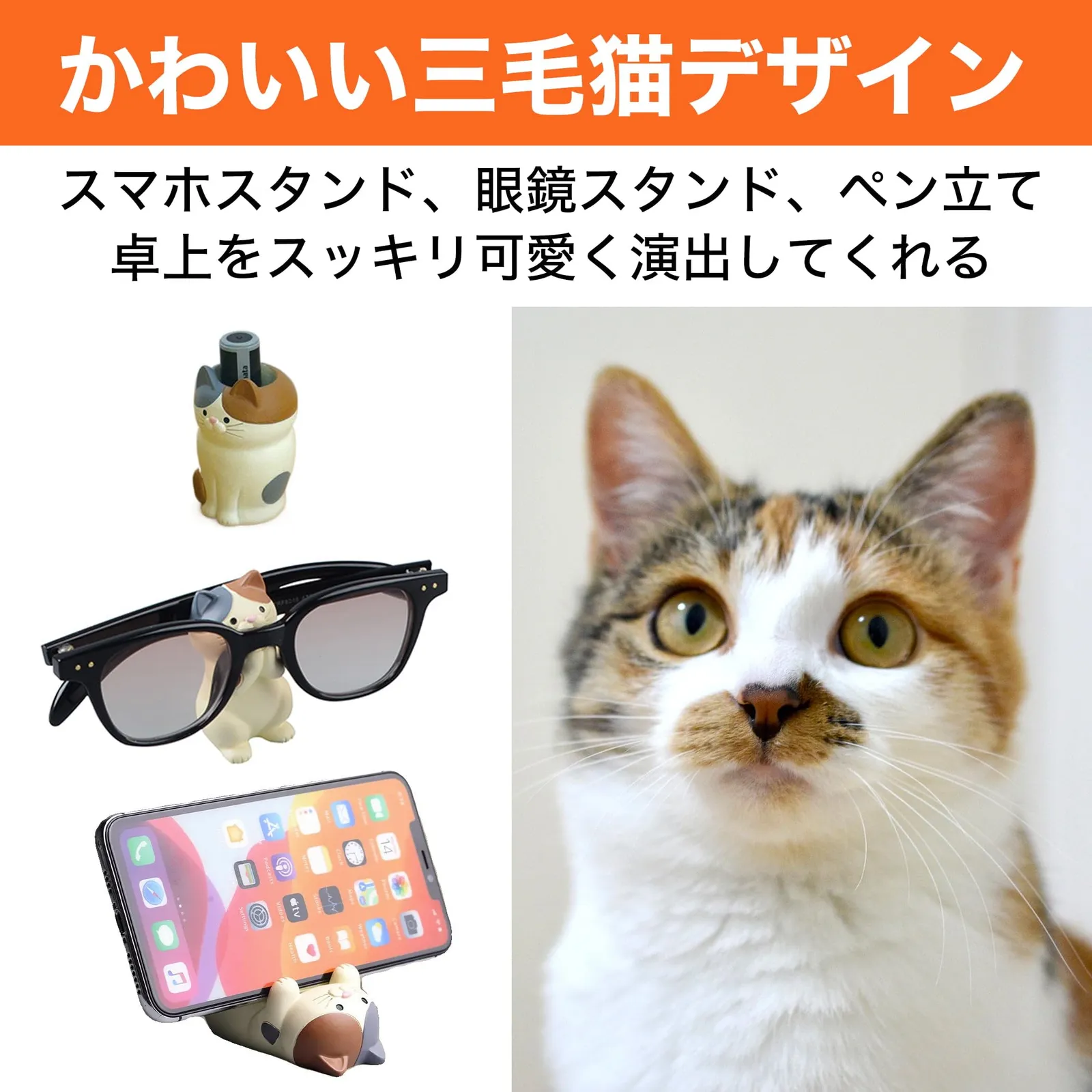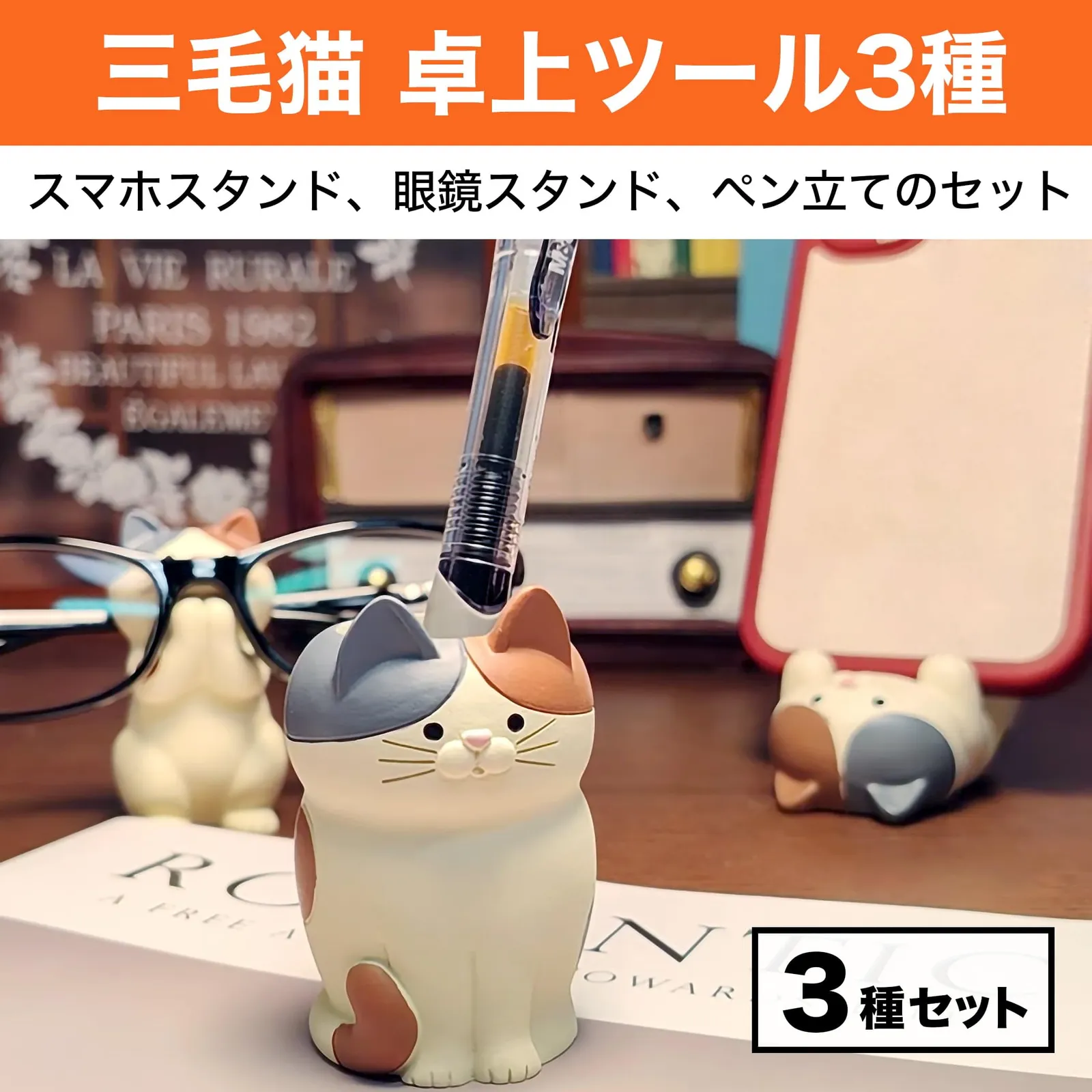 三毛猫デザインの卓上ツール3種:三毛猫型のスマホスタンド、眼鏡スタンド、ペン立てのセットです。省スペース設計で、卓上をスッキリ可愛く演出します。猫好きの方への記念品やお礼の品にもオススメです。置くだけで卓上で猫の集会が行われているような癒される空間を楽しめます。